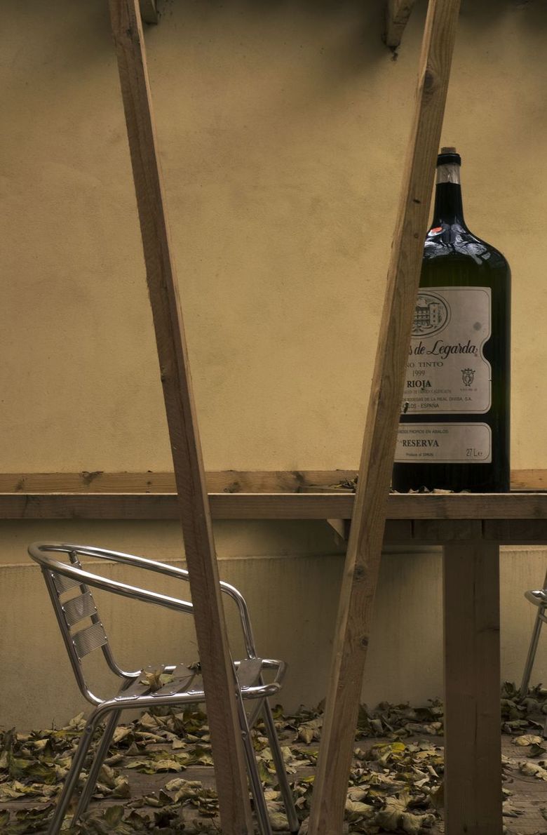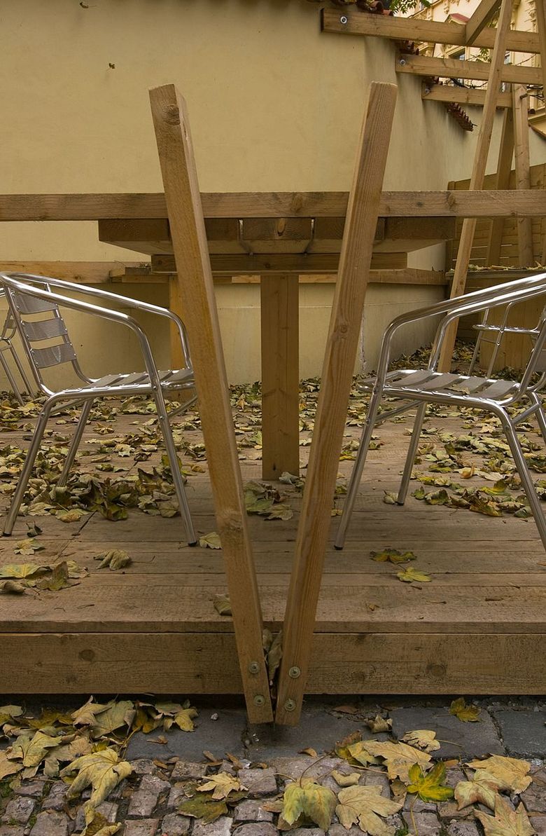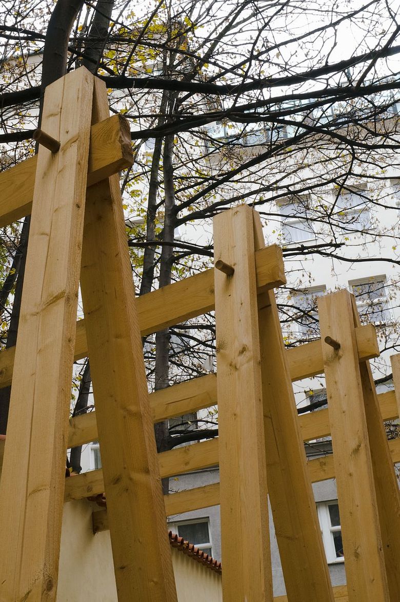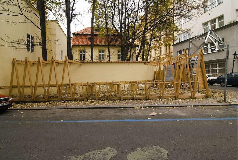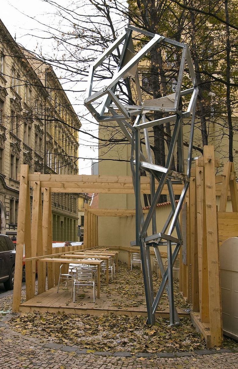 Last year we designed a front garden to the restaurant here – after obtaining approval from the owner of the site we only had to erect symbolic fencing from unplaned boards, turning it into a quiet place where people may sit in the centre under crowns of fully-grown maple trees. The wine depot owner enthusiastically accepted our idea that pieces of art by young artists could be exhibited in front of the entrance. Following an agreement with the Jarosav Fragner Gallery we installed the statue Sadrokarton story/Plasterboard story by Jakub Juráska here. Everything was finished in two days – mostly DIY – and ready to use.