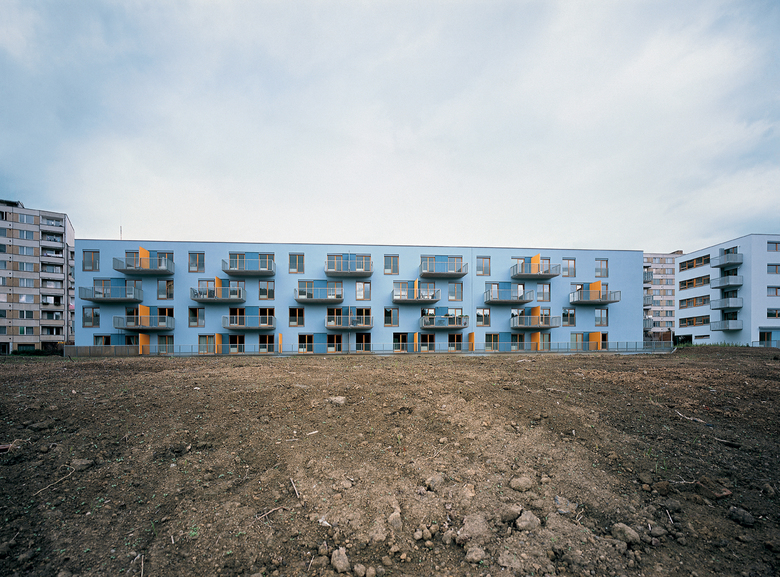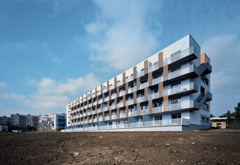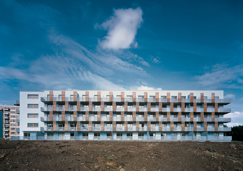 The plasticity of seemingly flat things, a fine game of lights and shades on planes and grating, a relative scale - a compact forest, a panel house - a slab … an important motive is the position on the edge of a group of panel houses - the elementary goal is creating architecture of buildings as a transition from a panel development to a free landscape - flats as close to the forest as possible, a forest penetrating in to the flats - large windows, wood to balconies.