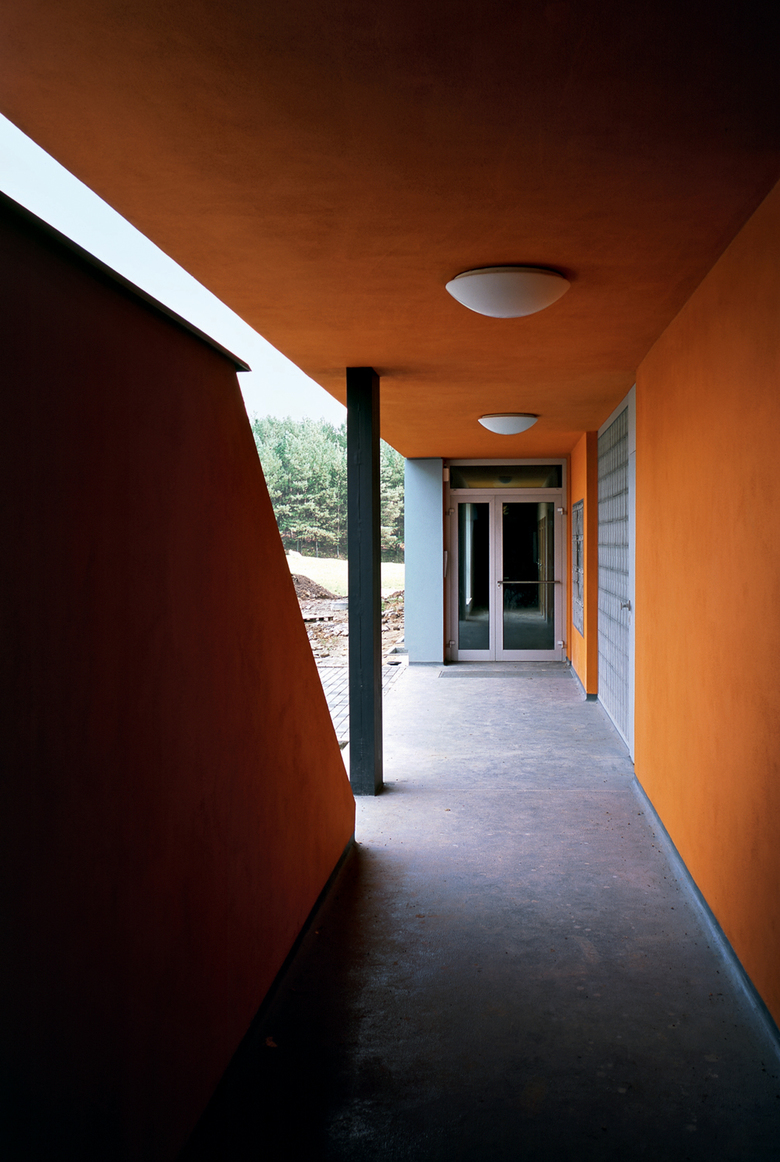 The design emphasizes simple clear shapes and proportions of the whole building and details. The north façade facing the panel houses is completely flat; their articulation projecting the internal arrangement of sections and corridors materializes in shallow embossments on the basic mass’ level - an exemption are the broken and emphasised entrances to the buildings or individual sections, as the case may be. The south front is on the contrary, richer in shapes and materials, boldly moulded balconies and their accessories.