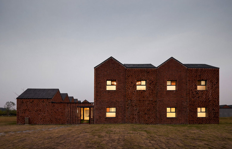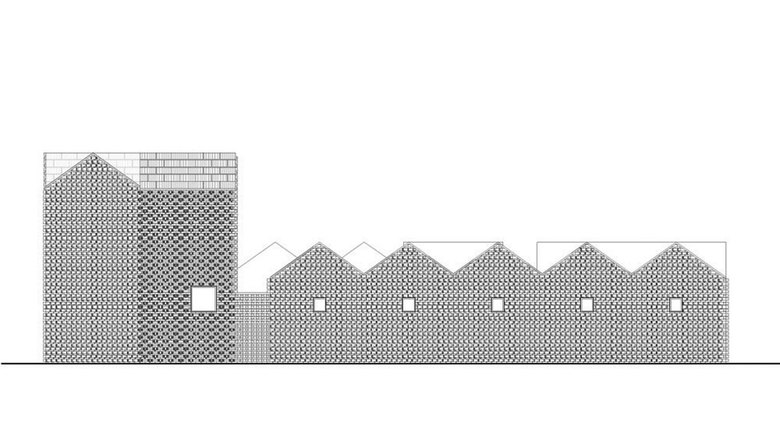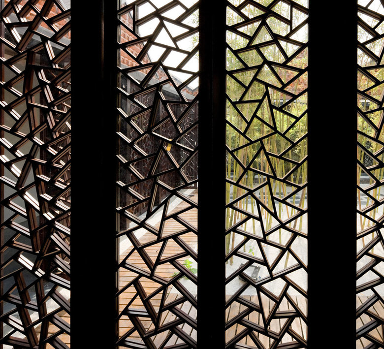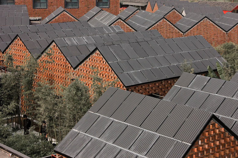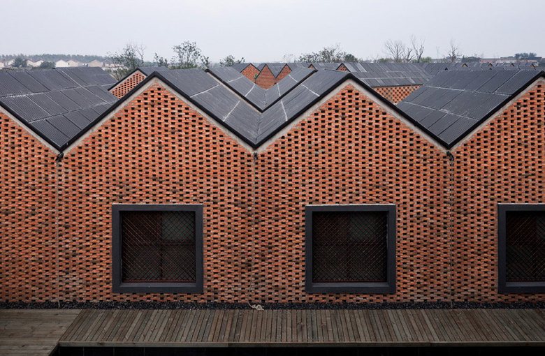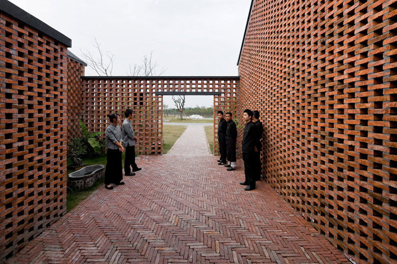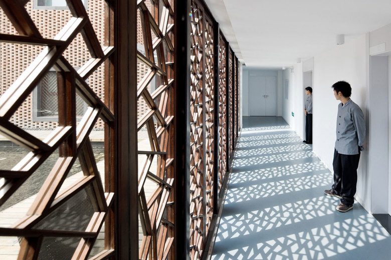 Another stunning topic is the use of the red bricks for the walls. They are made of local material and used for both, the construction as well as the skin of the buildings. Two different kinds of patterns where used to create an interwoven texture. For two sides of the buildings, every second brick is turned around and sticks out of the wall. Such a pattern creates an interesting play of shadow on the walls with only few regular openings. The second type is created by using the surface as a blind brick lattice, creating a negative pattern, that has an interesting texture in the light of the sun. In other words we could say that it is a modern interpretation of the old Chinese balancing system of yin and yang, positive and negative, masculine and feminine.