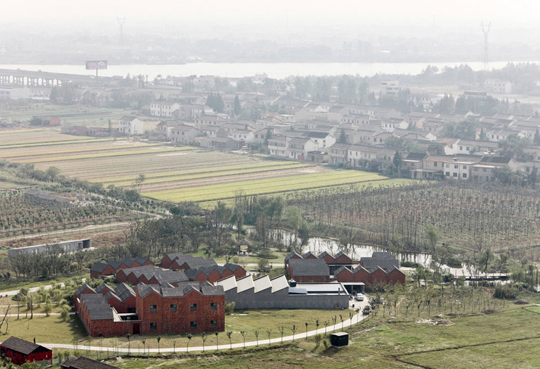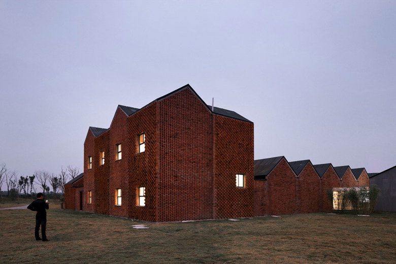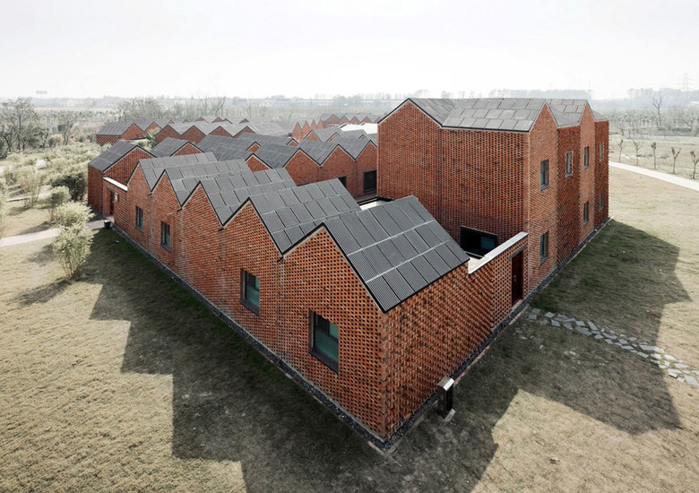 "The city of Yangzhou is located at the edge of Yangtze River in Jiangsu province not far from provincial capital Nanjing. As any other city in China, Yangzhou is rapidly expanding. In a newly developed area in the east of famous Grand Channel, which passes through the city, Zhang Lei designed a community centre consisting of three buildings. On one side of the centre there is a business-park with new office buildings whereas on the other side an old village of local farmers is located. The new community centre is aimed to serve for both, the people of the village as well as those working in the new business-park. Each of the three buildings is composed around several courtyards with bamboo, stone and water in the typology of the nearby villages. They are embedded in a bigger open public park with trees and bamboo and a nearby stream. The single complex is composed of many small, one-storey units with pitched roof. The reference to the local village architecture is obvious. Besides the formal reference of the single architectonic element, the red bricks of the exterior walls and the use of open walkways with traditional wooden lattice-works in the pattern of crushed ice, make the renewal of historic elements in contemporary architecture a success.
