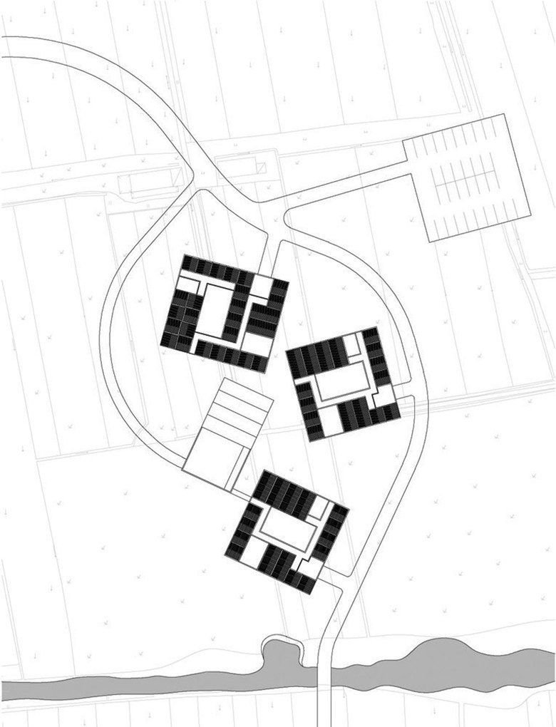 Zhang Lei bonds several pitched roof units into an additive structure and uses this method for each of the three complexes. Thereby the square or rectangular form is taken for the interior open and closed spaces, in accordance with traditional space pattern. The series of pitched roofs on each side of the courts give them the appearance of a small village and breaks the complex visually into clusters that refer to local typology. One of the three clusters has a block composed of two storey elements, each with the pitched roof turned around 45º. The visual appearance of this block with its turned roof’s, adds a surreal flavour to the traditional forms and refers to a cultural discourse about architecture far beyond the local cultural context.
