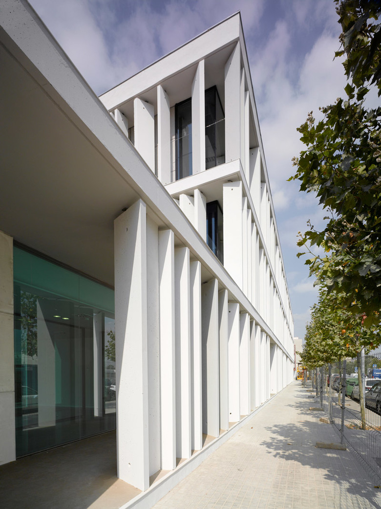 A simple three-strip layout with the offices separated by courtyards is veiled by a uniform skin of vertical white concrete slats that envelops the building. The slats, with differing slopes and spacings, generate an image that presides over the new plaza with a building that is weighty, sober and opaque from a distance and transparent from the inside.