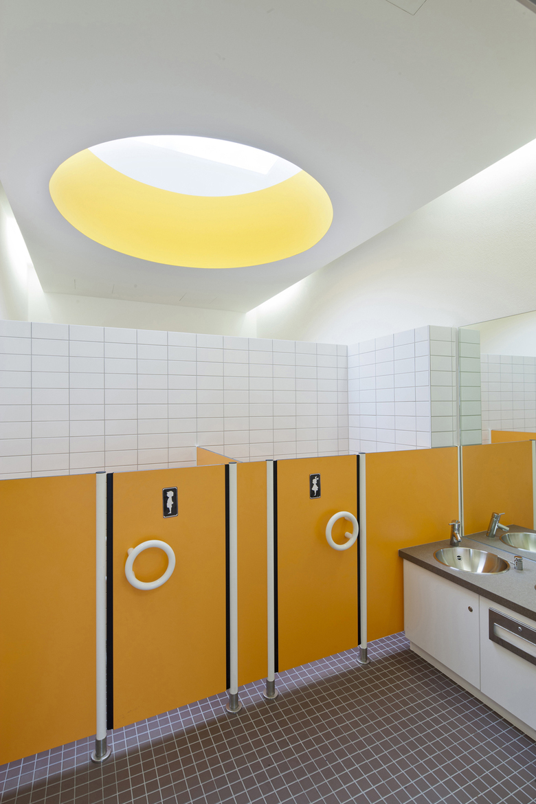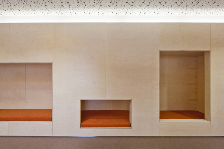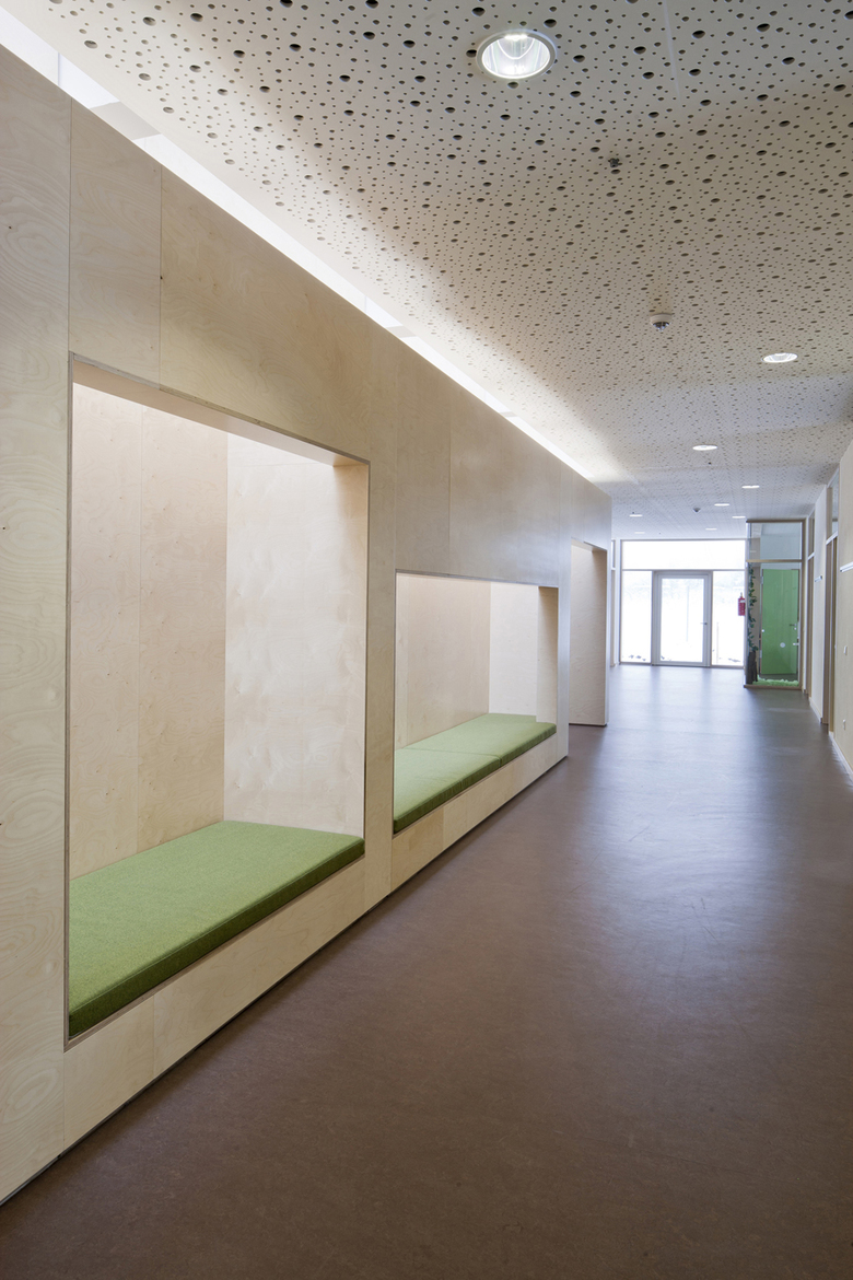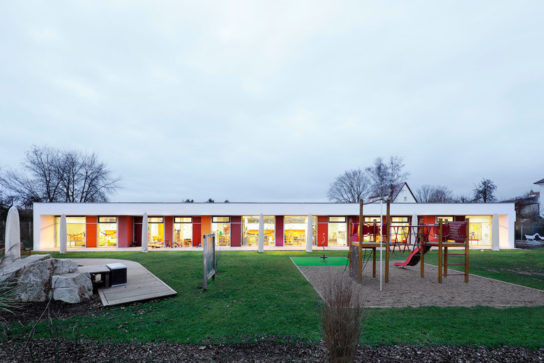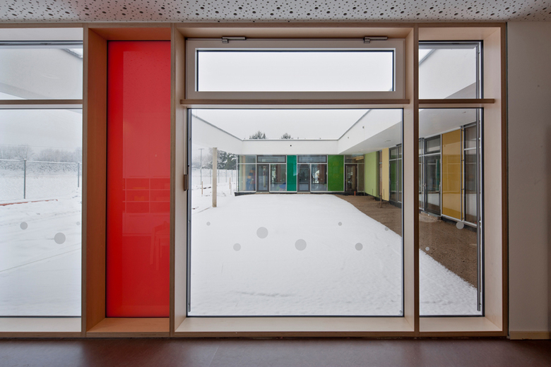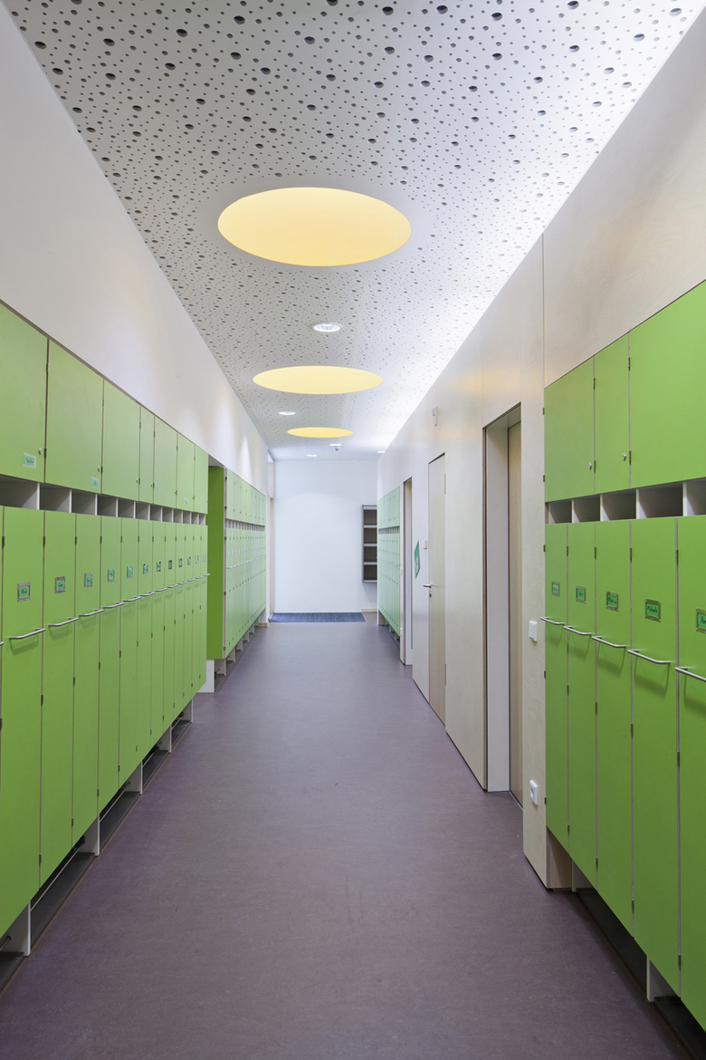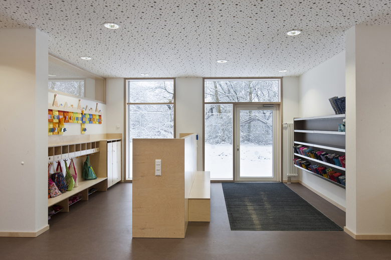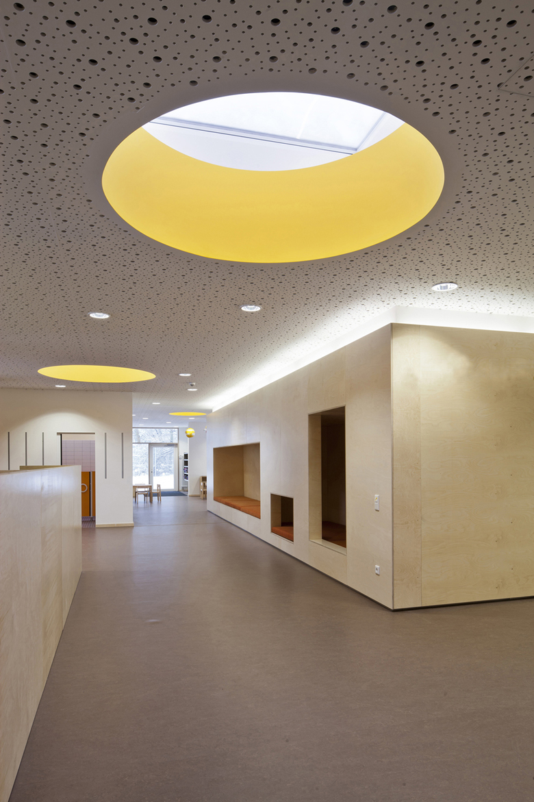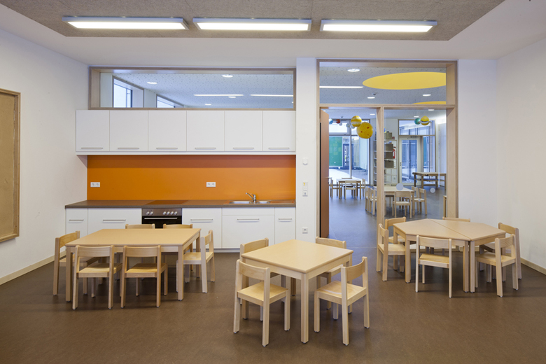 Auf das brache Grundstück situieren wir ein Gebäudeensemble aus 3 unterschiedlichen Bausteinen unter einem gemeinsamen Dach: ein Kindergarten, ein Kinderhort und ein übergeordneter Mehrzweckbereich als gemeinsame Begegnungsstätte beider Funktionsbereiche. Alle Bausteine werden über die zentrale Eingangshalle, das Foyer, betreten. Jeder Baustein ist zur Sonne nach seiner täglichen Nutzung ausgerichtet: der Kindergarten nach Osten, der Mehrzweckraum mit Mittagsbetreuung nach Süden, der Kinderhort nach Westen.