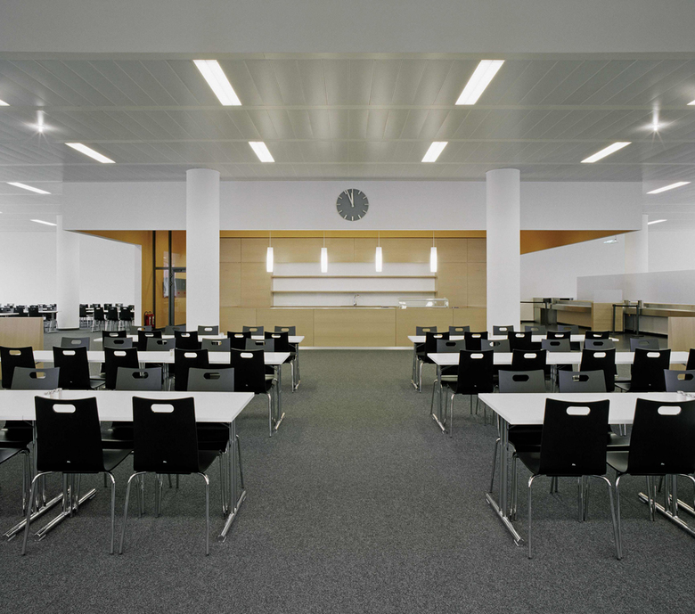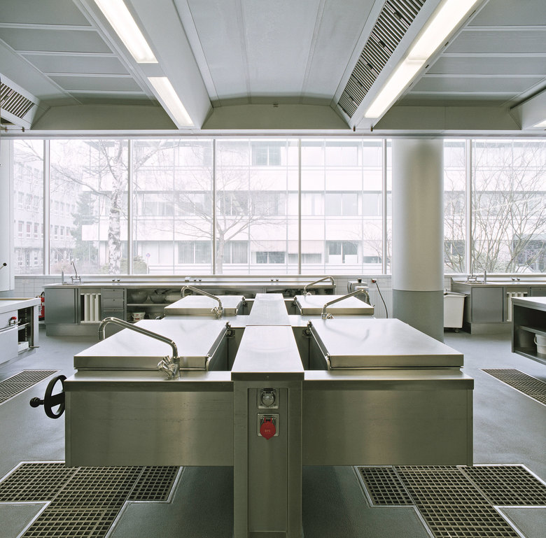 Unter Wahrung der prägenden großzügigen Raumarchitektur (Produktionsküche mit hohem Fensterband zum Straßenraum / zweiseitig belichteter Speisesaal mit Laternengeschoss) wurde die gesamte Baumaßnahme bei fortlaufendem Betrieb in vier Bauabschnitten realisiert.