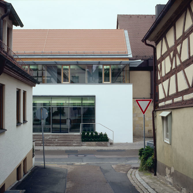 Die Volumenerhöhung der vormals eingeschossigen alten Geschäftsstelle aus den 60er Jahren in der „2.Reihe“ der Innenstadt von Herzogenaurach, behebt gravierende Schwachpunkte des Bankhauses. Städtebaulich verhilft der Anbau mit Aufstockung zu mehr Dominanz im kleinstädtischen Raum. Architektonisch „streckt“ der Neubau den ebenfalls zum Bankhaus gehörenden problematischen Sandsteinbau aus den 80er Jahren als Vertreter heimattümelnder Möchtegern-Sandstein-Architektur. Funktional erhält das Bankhaus einen neuen, attraktiven und höchst einladenden (auch barrierefreien) Eingang. Der alte Kundenbereich im Erdgeschoss wird entkernt und um ein transparentes Geschoss aus Stahl und Glas mit gliederndem Satteldach aufgestockt. Im neuen Innenraum werden Erd- und Obergeschoss durch eine große Öffnung zum Atrium verbunden und mit Tageslicht versorgt. Die vertikale Erschließung erfolgt über bestehende Treppenhäuser.