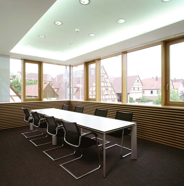 Die Halle im Erdgeschoss dient hauptsächlich dem kurzweiligen 1.Kontakt mit Schaltern Kasse und 2 temporär nutzbaren Beratungsbüros bleibt ansonsten als neutraler Verweilraum von Nutzungen freigestellt. Beratungsintensive Funktionen werden in das neue Obergeschoss verlagert. Alle neuen Büros umrahmen das Atrium als transparente Membrane: gläserne Bürotrennwände garantieren ein Maximum an Transparenz zwischen Halle und Arbeitsbereichen. Die scheinbar über dem massigen Erdgeschoss schwebende gläserne Außenfassade führt den Gedanken der Transparenz in den Straßenraum fort. Eine auskragende Stahl-Gitterrostkonstruktion schützt alle verglasten Seiten wirkungsvoll gegen die Sonne. Massiges Sockelgeschoss und transparentes Obergeschoss reflektieren das klassische fränkische Haus mit Sandstein im Erdgeschoss und Fachwerk im Obergeschoss. In Summe bietet die Raiffeisenbank nun ihren Kunden ein neues Ambiente für erstklassige Beratung in abgerückter Lage.