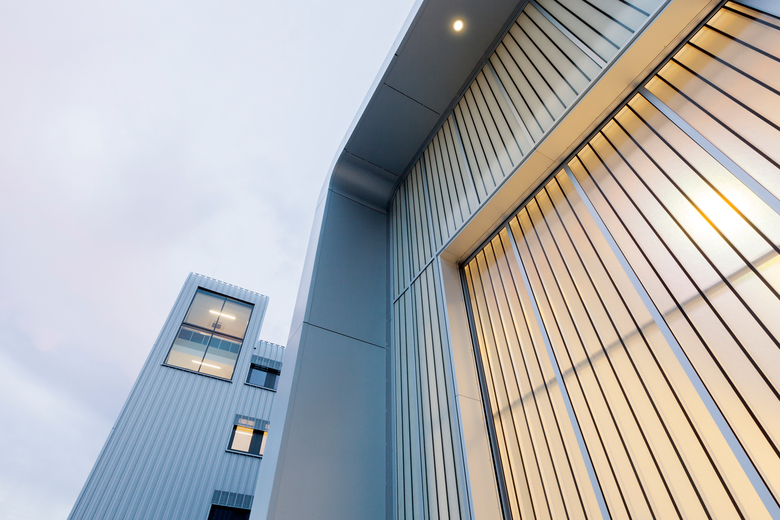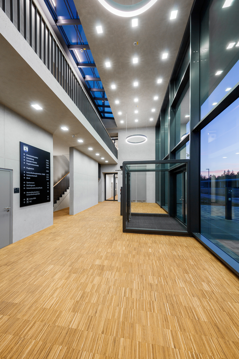 Die Hallen wirken mit ihren transluzenten Toren, den Oberlichtern und den hellen Oberflächen sehr licht. Durch die Verwendung von Holz entsteht ein ‚warmer‘ Eindruck, der wirkungsvoll im Kontrast zu den ansonsten ‚kühlen‘ Materialien wie Sichtbeton, Estrich und Aluminium steht.