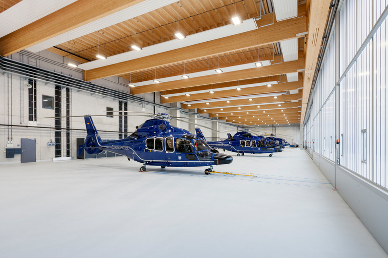 Der ca. 250m lange Baukörper besteht aus Hubschrauber-Abstell- und Wartungshallen mit Waschhalle, zugehörigen Werkstätten mit Krananlage, Lager- und Büroflächen. Im Endausbau mit Landespolizei wird das Gebäude eine Länge von 355m aufweisen.