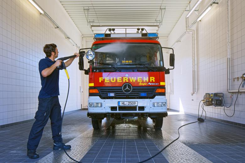 Der Entwurf wurde konsequent aus den funktionalen Anforderungen heraus entwickelt. Die Zugänge für Feuerwehr und Rettungsdienst liegen an zentraler Stelle im Gebäude. Von hier aus sind alle Bereiche auf kurzem Wege erreichbar. Die Aufenthalts- und Ruheräume der Feuerwache sind im 2. Obergeschoss, die Umkleide- und Sanitärbereiche im Zwischengeschoss angeordnet. Die Werkstatt- und Lagerflächen liegen konzentriert im Erdgeschoss, dem Betriebshof zugewandt.