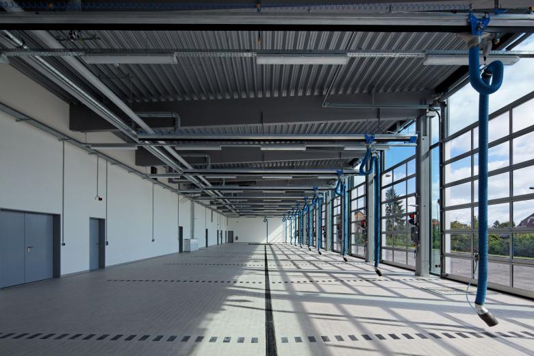 Die großen, gläsernen Tore geben den Blick in die Fahrzeughalle frei und bilden die Schauseite zur Stadt. Die Fassade ist mit einem Aluminium-Lochblech verkleidet, welches die dahinterliegenden Fenster vor Verschmutzung schützt und als Sonnenschutz dient. Einzelne Bereiche werden geöffnet und zeigen die zurückspringende, rote Fassade.