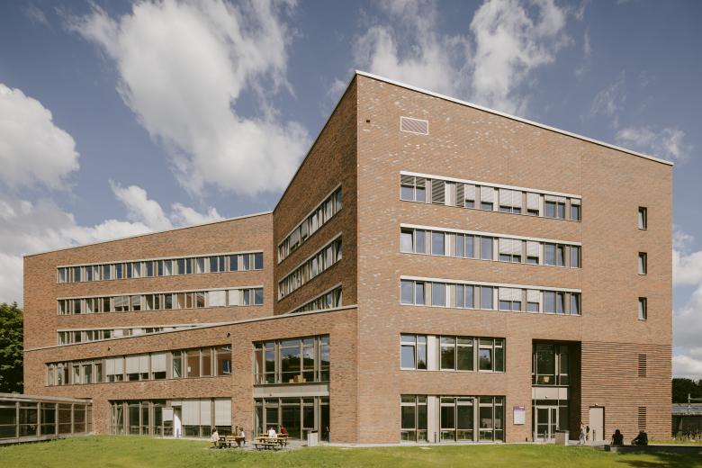 Der skulpturale Baukörper orientiert sich im Osten und Norden an der vorhandenen Gebäudestruktur, wendet sich nach Westen und Süden jedoch bewusst der Freifläche des Angers zu. Der rote Ziegelbau nimmt ein für Institutsgebäude typisches Material des Kieler Campus auf, setzt jedoch durch Formgebung und Fassadenstruktur zeitgenössische Akzente. Ein deutlicher Rücksprung über zwei Geschosse an der Ludewig-Meyn-Straße führt als einladende Eingangsgeste in das auch vom Anger zugängliche Foyer, von dem aus Instituts- und Seminarbereich erschlossen werden.