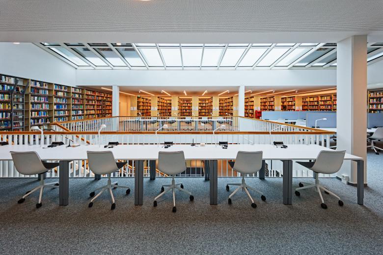 Über den Haupteingang gelangt man in das Foyer des Gebäudes, das mit dem lichtdurchfluteten Atrium einen zentralen Kommunikations- und Interaktionsraum bildet. Offene Arbeitsplätze mit unterschiedlichen Aufenthaltsqualitäten sind sowohl um das Atrium als auch auf den Galerien in den Obergeschossen angeordnet. Die zentralen Hörsäle, Seminar- und Multifunktionsräume werden ebenfalls von dort erschlossen. Das Herzstück, die Bibliothek, die sich über zwei Geschosse erstreckt, wird durch ein großzügiges Glasdach mit Licht durchflutet.