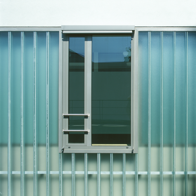 Das Gebäude besitzt - seiner Nutzung entsprechend - eine innovative Fassade aus grünlichen Gussglaselementen.