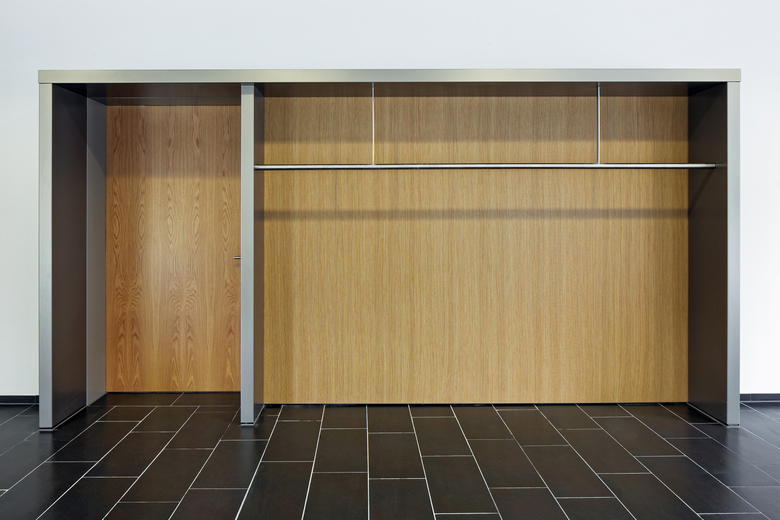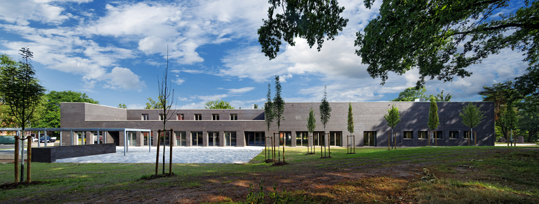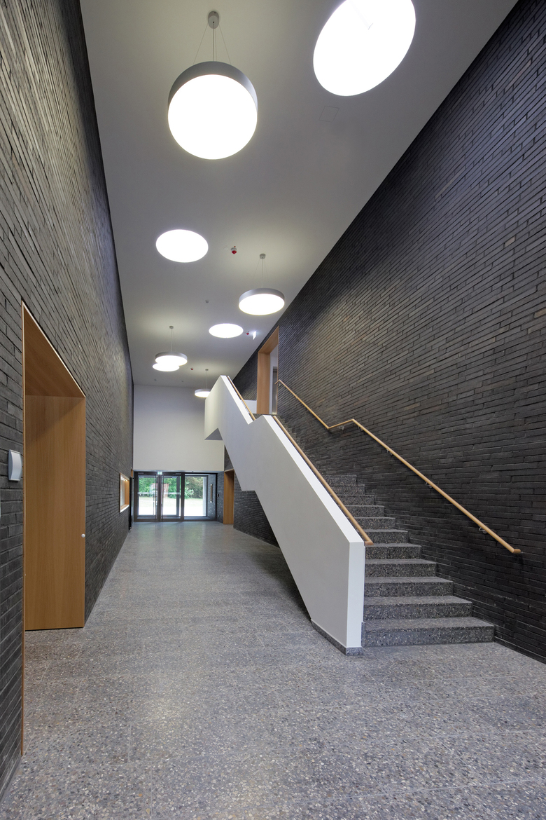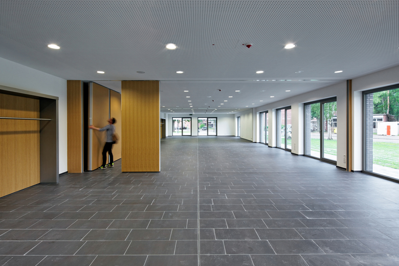 Die umfangreichen Technikräume sowie die Mehrzweckräume und die Kegelbahn wurden im 1. Obergeschoss angeordnet, so dass in Verbindung mit dem überhohen Speisesaal ein insgesamt zweigeschossiger Baukörper entstanden ist.