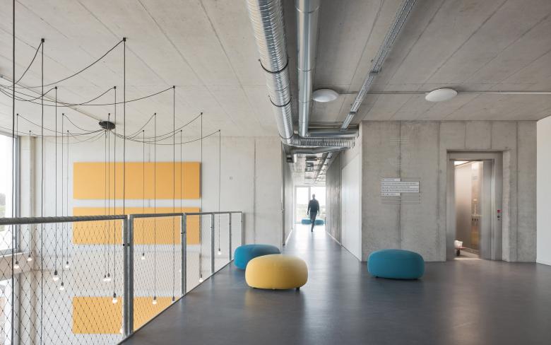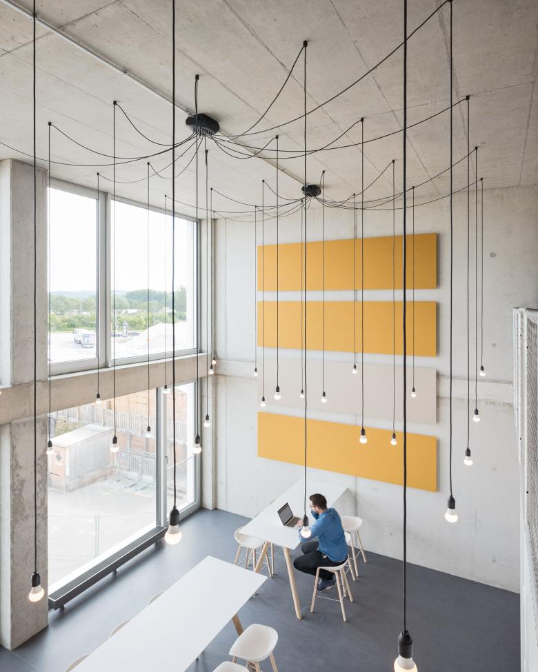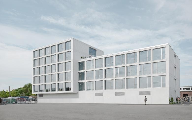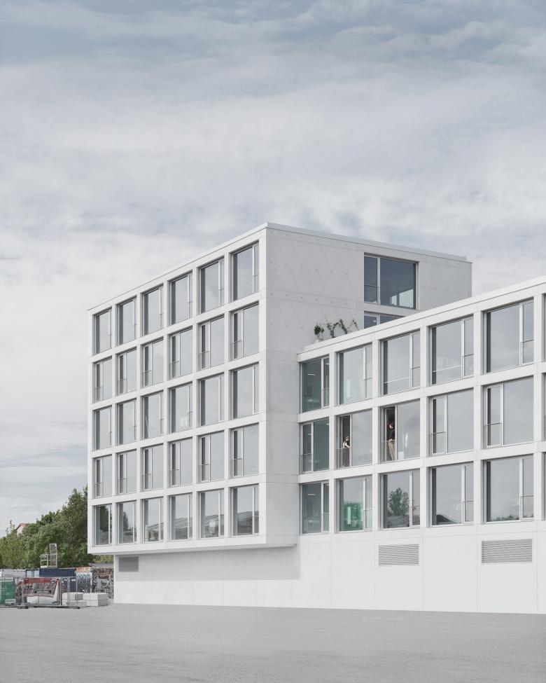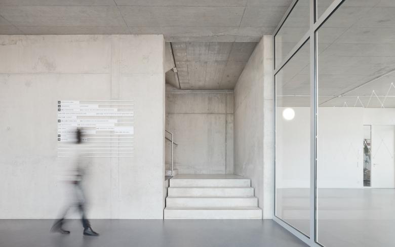 Die robuste bauliche Struktur und Organisation des Gebäudes erlauben eine vielfältige Nutzungsveränderung und Einteilung. Diese ermöglichen insbesondere eine prozesshafte Aneignung des Gebäudes durch die Mieter. Die Stahlbetonoberflächen im Innenraum wurden roh und materialfarben belassen. Für exponierte Betonflächen wird bewusst auf eine hohe Sichtbetonklasse verzichtet. Die Installationsführung erfolgt an den Decken sichtbar in verzinkten Stahlrohren und Kabelpritschen sowie in einem einfachen Hohlraumboden. Der industrielle Charakter wird durch die Verwendung von Halbzeugen betont und durch wenige gezielt gesetzte Akzente in der Möblierung kontrastiert. Aufgrund der Flächen- und Kubaturoptimierung, der Auswahl weniger industrieller Materialien sowie einem angemessenen Technikkonzept (so wenig wie möglich, soviel wie nötig), konnten die ehrgeizigen Vorgaben des Budgets eingehalten werden. Den Nutzern können nun kostengünstige Mietflächen in einem veredelten, unprätentiösen Rohbau mit Loftcharakter angeboten werden. Die exponierten Betondecken sind sehr gut für den Einsatz einer Bauteilaktivierung geeignet. Zur Beheizung und Kühlung wird daher geothermische Wärme und Kälte genutzt. Die Erschließung erfolgt über insgesamt 15 Erdwärmesonden mit Tiefen zwischen 90 und 130 Metern unterhalb des Gebäudes.