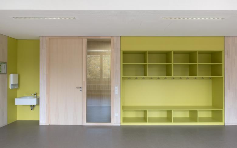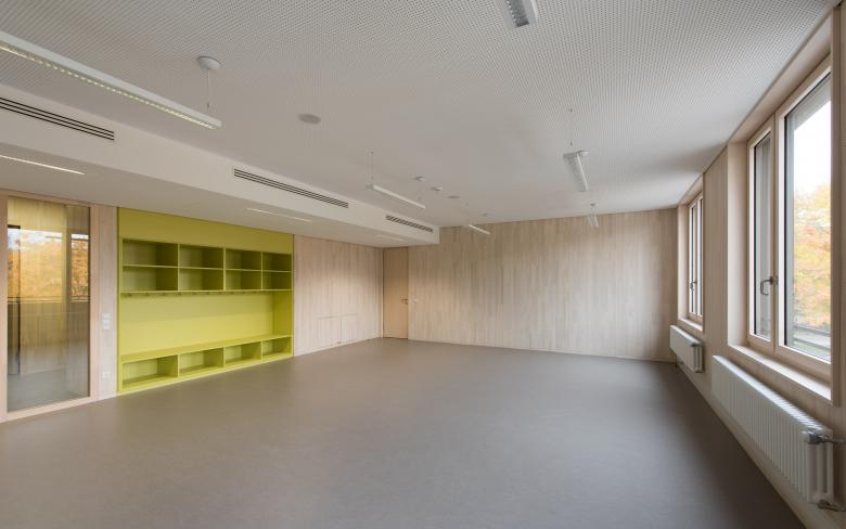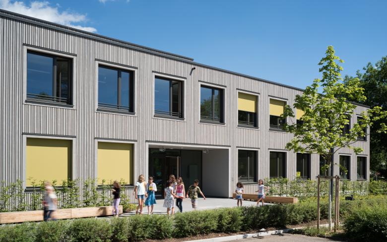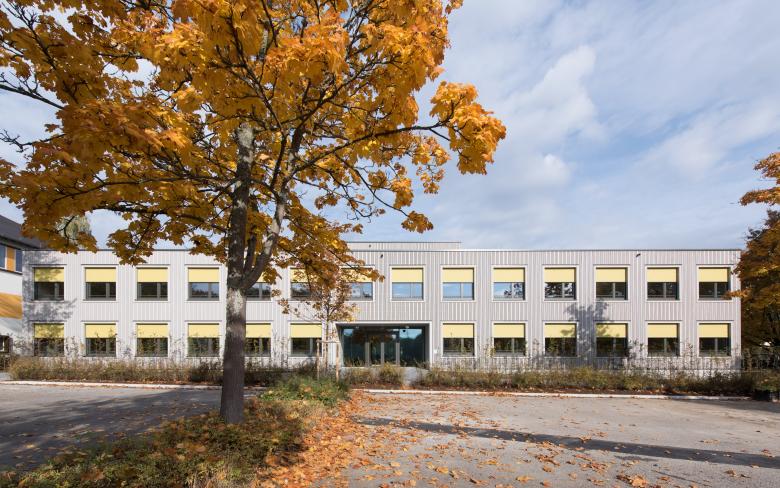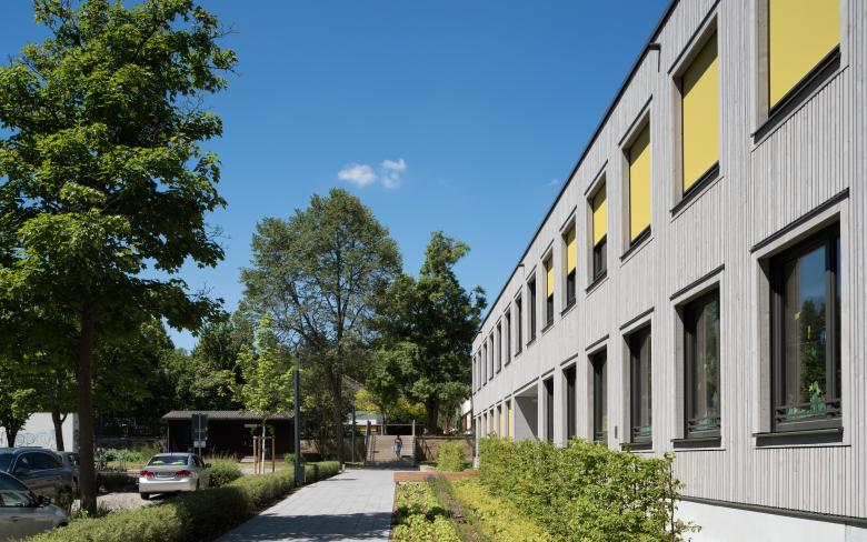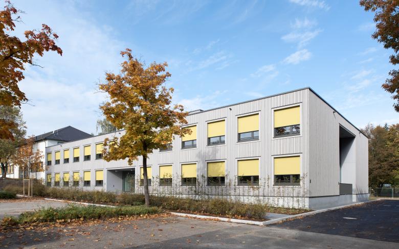 Das energieoptimierte Interimsgebäude wurde als konstruktiver Holzbau mit Holzrahmenbauwänden und einer Balkendecke umgesetzt. Der hohe Vorfertigungsgrad hat eine schnelle Bauzeit von lediglich acht Monaten ermöglicht. Die sichtbaren Holzoberflächen bestehen aus heimischer Weißtanne. Für die Fassadebekleidung kam das gleich Holz, allerdings einheitlich vorvergraut zum Einsatz. Das Gebäude kommt auf der Längsseite mit einem einheitlichen quadrastischen Fensterformat aus. Ein farbiger textiler Sonnenschutz vermeidet die sommerliche Überhitzung des Gebäudes.