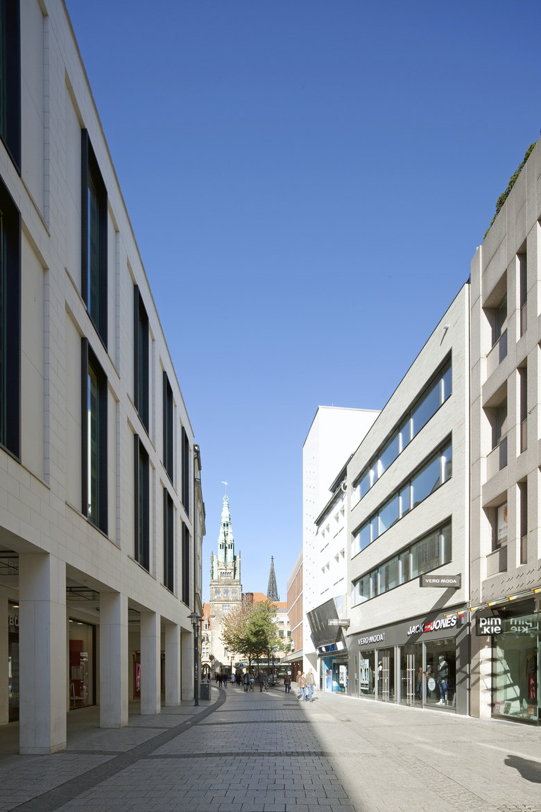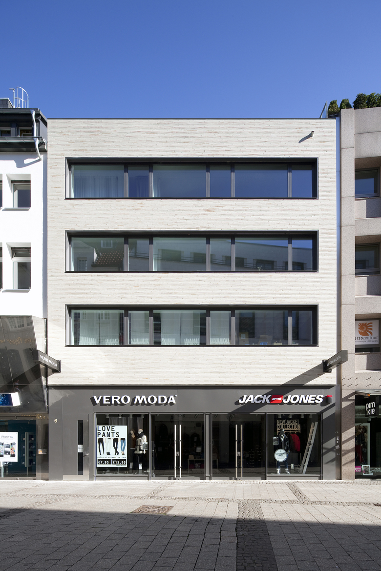 Die Erdgeschoßfassade wurde als ein leicht zurückspringender Sockel aus flächigem Aluminiumblech unter dem aufgehenden Verblendmauerwerk eingerückt. Die Schaufensterverglasung ist hier einem Passepartout-Ausschnitt gleich eingesetzt. Die Außenwerbungen folgen den Festsetzungen der Altstadtsatzung. Der Hauseingang ist in einer zurückhaltenden Bescheidenheit mit einem schmalen Sichtfenster und einer Edelstahlblende flächig auf der Fassade abgezeichnet.