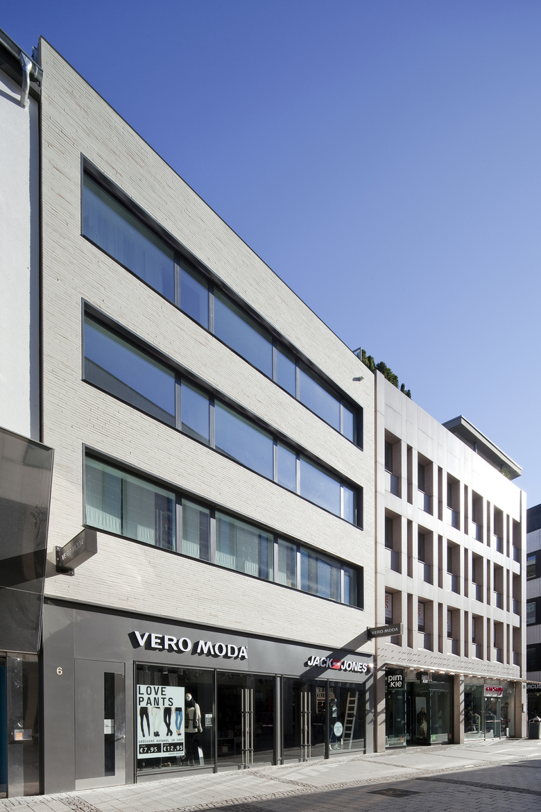 Die Materialität der Fassade wurde auf Glas, beigefarbene Klinker und anthrazitfarbenes Aluminium reduziert. Die Fassadensanierung hielt die charakteristische Bänderung der Fassade bei. Der beigefarbene Klinker wurde in einem besonders langen und dünnen Riegel-Format gewählt und mit farbgleichem Fugmörtel bündig verfugt, sodass eine homogene flächige Fassade entsteht. Mit dem Klinker wurde ein traditionelles Material gewählt, welches sich in seiner Farbigkeit an der bestehenden Umgebung orientiert, in seiner Proportion und Fügung aber feinsinnig differenziert ist.