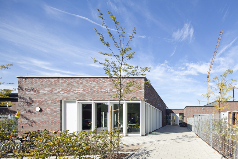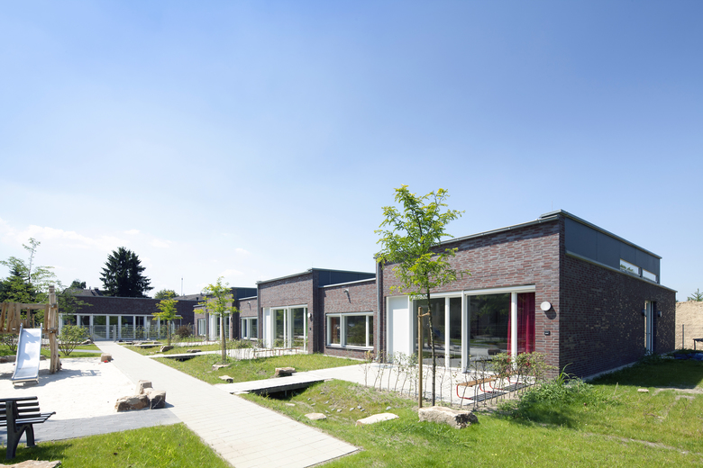 In dem anderen Gebäudeschenkel befindet sich der Kindergarten. Die Gruppenräume des Kindergartens sind nach Süden ausgerichtet und die Freiflächen dem Gebäude vorgelagert.