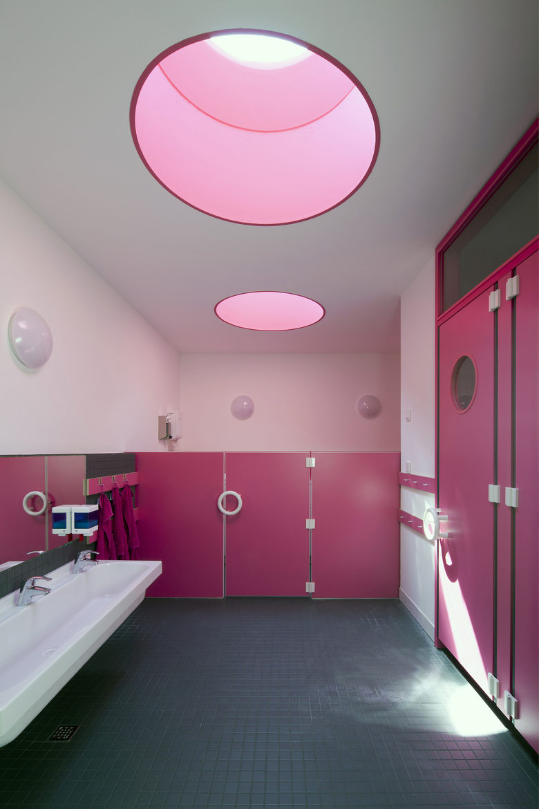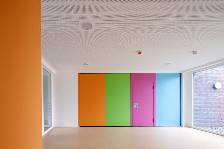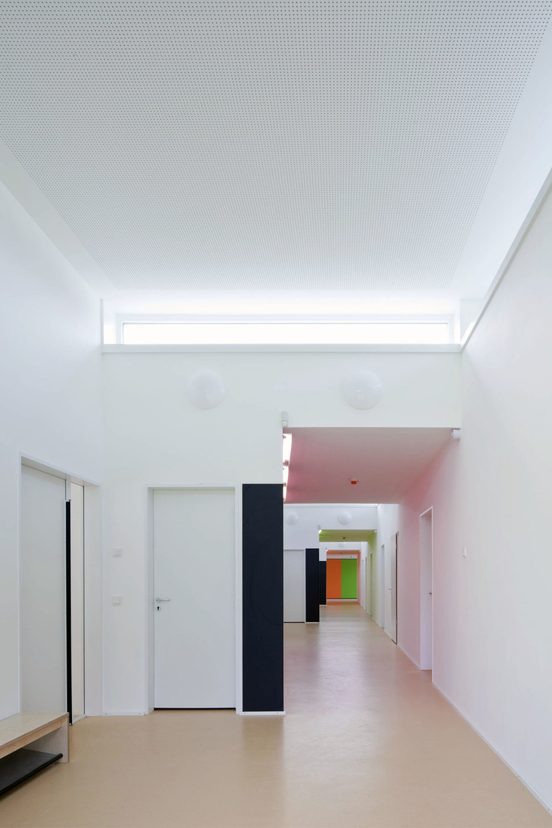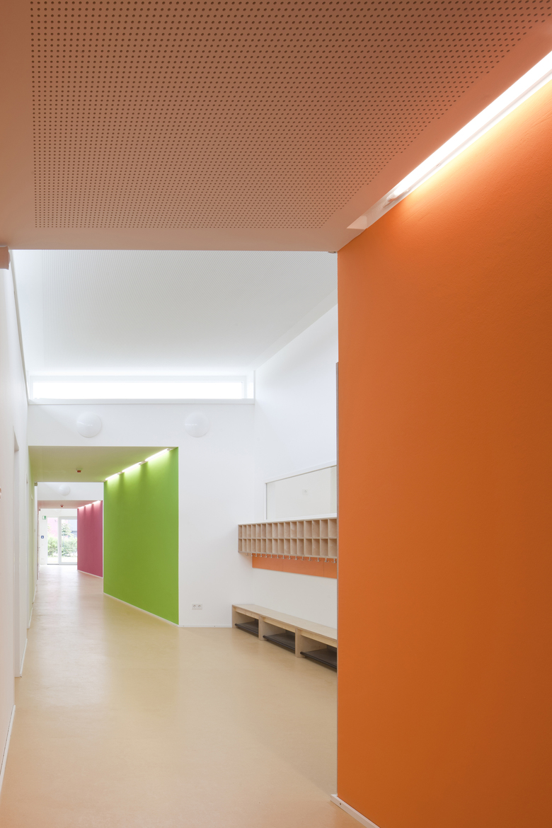 Jeder Gruppe wird eine prägnante Farbe zugeordnet. Das schafft für die Kinder eine gute Orientierung. Diese Leitfarben wiederholen sich in der Möblierung, den Waschräumen und den Garderobenbereichen. Die einzelnen Gruppeneinheiten sind auch in der Fassade klar ablesbar. Dies geschieht zum einen durch die Erhöhung der Gruppenräume aber auch durch das leichte Herausschieben aus der Fassadenflucht. Den Gruppenräumen vorgelagert befinden sich kleine Terrassen.