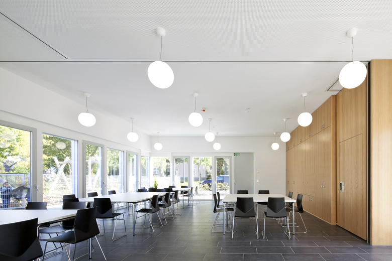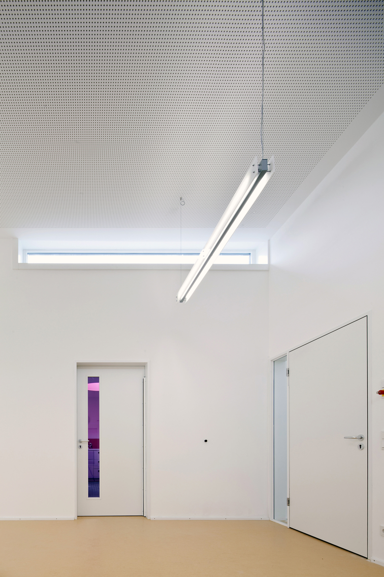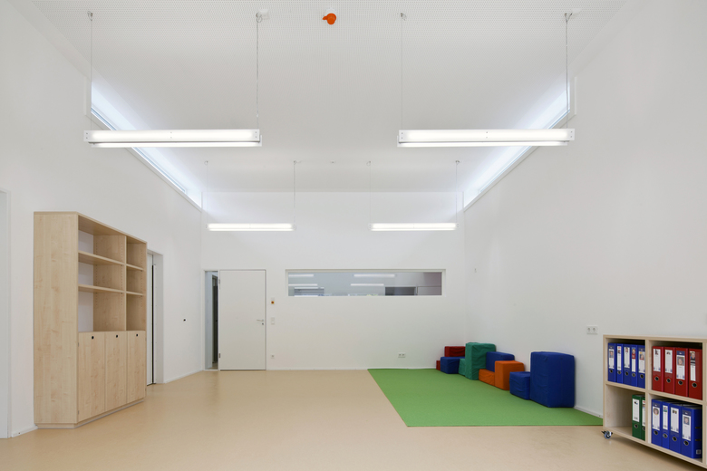 Der Mehrzweckraum des Kindergartens befindet sich in dem nördlichen Teil des Pfarrsaal-Riegels und kann über eine mobile Trennwand mit der Eingangshalle des Kindergartens zusammengeschaltet werden. Der Kindergarten ist so konzipiert, dass die Gruppeneinheiten im Grundriss klar ablesbar sind. Die schräg gestellten, farbigen Wände der Abstellräume zonieren und rhythmisieren den Flurbereich. Großzügige Oberlichtkränze in den Garderobenbereichen unterstützen diesen Rhythmus und bringen viel Tageslicht in die Mittelzonen.