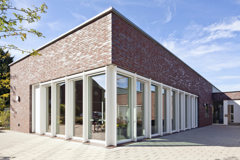 Das Gebäude ist mit einem dunkelroten Klinker verblendet. Die Fenster sind als weiße Holzfenster ausgeführt.