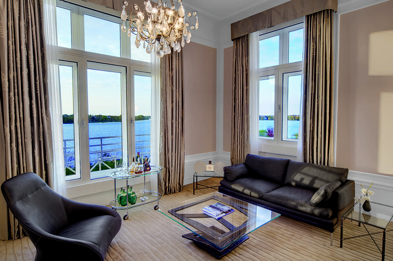 Die Gestaltung nimmt Bezug auf die über 100jährige Geschichte des Hauses als Grandhotel für Passagiere der Transatlantik-Luxusliner und Hamburg als Tor zur Welt. Unterschiedliche Dekorwelten prägen die einzelnen Etagen. Die 1. Etage ist inspiriert von Afrika mit erdigen Tönen und Farben der Wüste, in der 2. Etage erinnern blaue Farbtöne und glänzende Silberornamente auf Brokat an die Belle Epoque Europas. Kräftige Violett-Töne und großflächige geometrische Muster verweisen in der 3. Etage auf das Art Déco der 1930er Jahre Amerikas. In der 4. Etage dominieren als Hommage an Asien Rot-Gold-Töne und Seidenstoffe. In der Atlantic-Suite mit über 100 m² kommt der moderne Luxus dieses Grandhotels mit handgefertigten, extra weichen Teppichböden, Vorhängen aus Rubelli-Seide und anderen hochwertigen Materialien in Kombination mit moderner Kunst und Designermöbeln zur vollen Geltung.