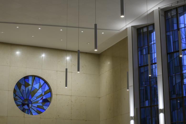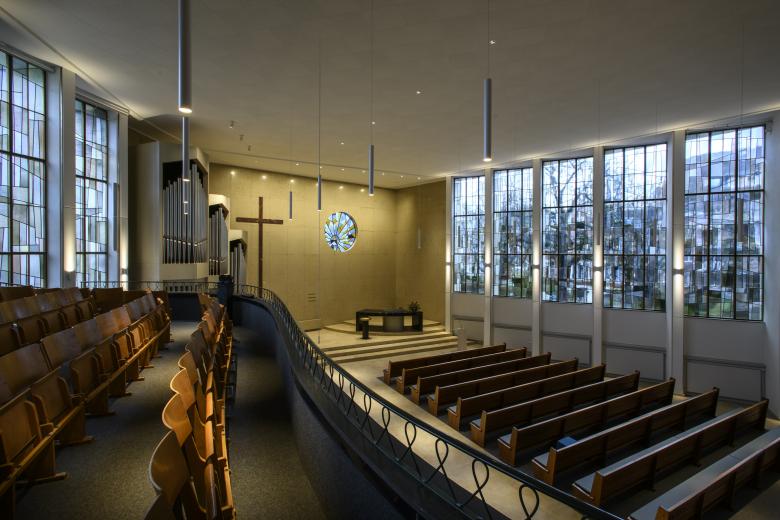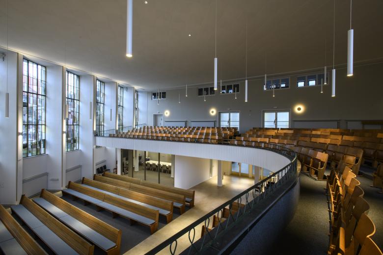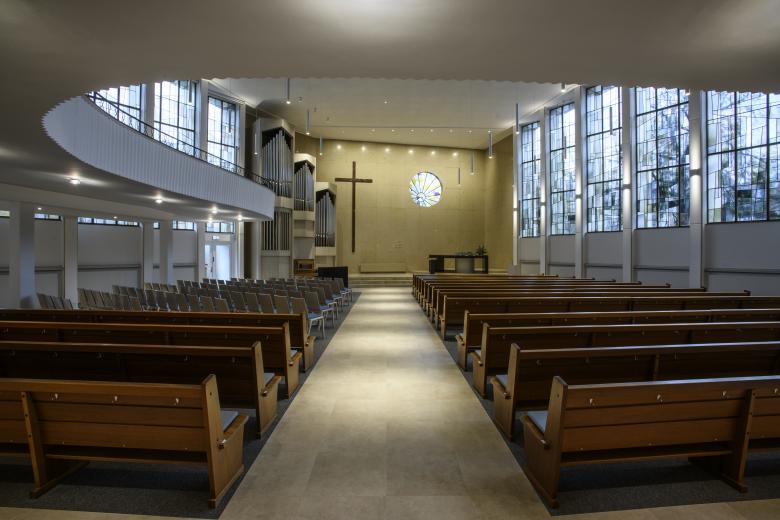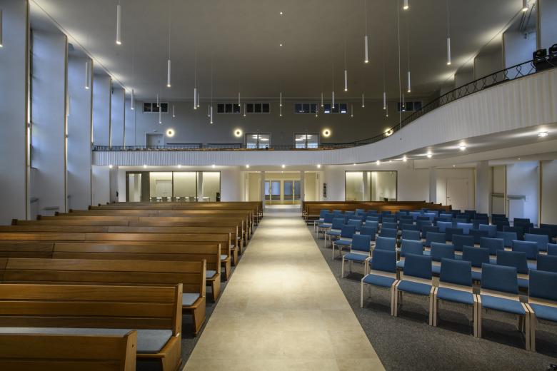 Nach nunmehr 65 Jahren Nutzungsdauer wurde das Bauwerk im Rahmen einer umfassenden Sanierung und Modernisierung – in enger Abstimmung mit dem zuständigen Denkmalschutzamt – erneut an den zeitgemäßen Gemeindebetrieb angepasst. Notwendige Einbauten wurden sensibel in die bestehende Innenarchitektur und Raumkonfiguration integriert. Hier sind vor allem die neuen Familienräume im Erdgeschoss zu nennen.