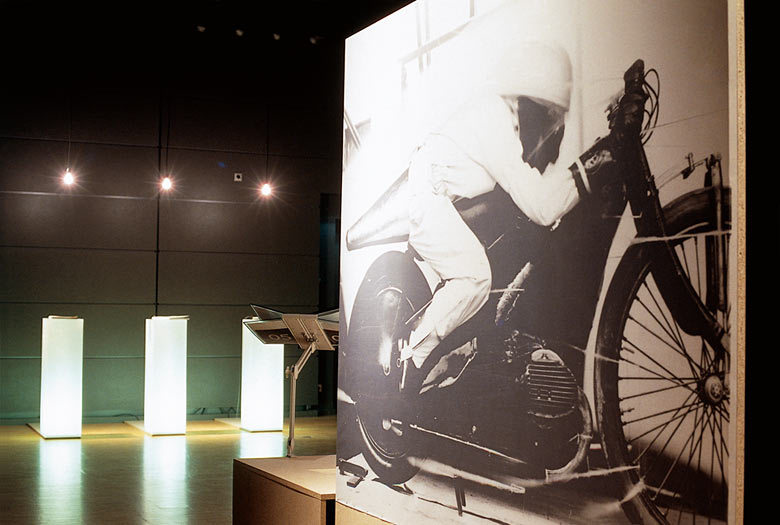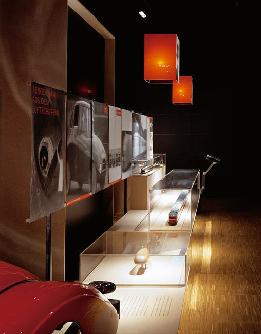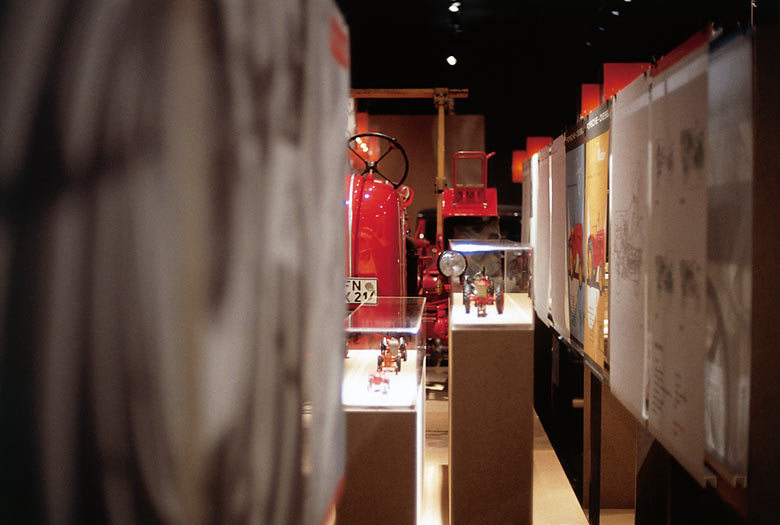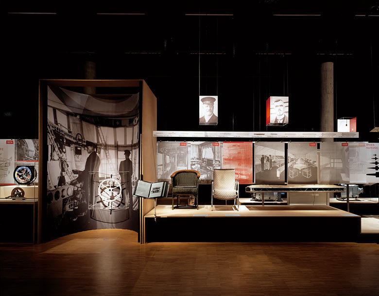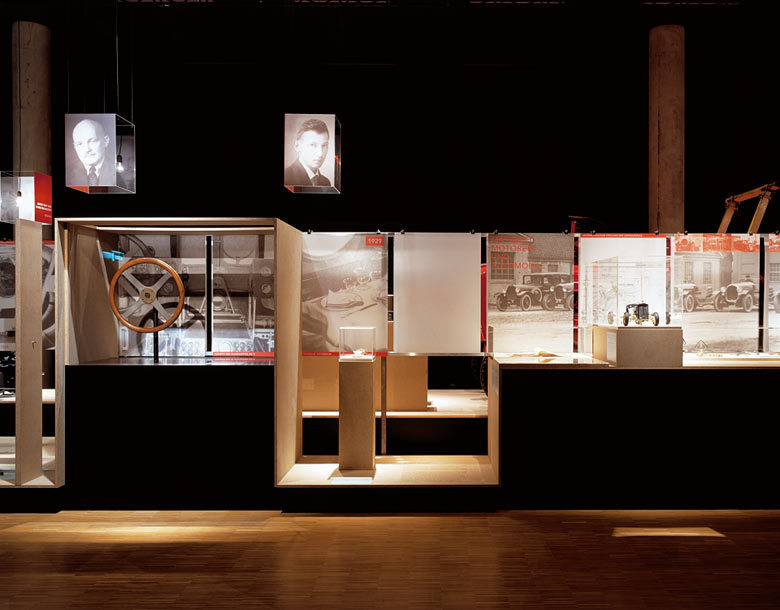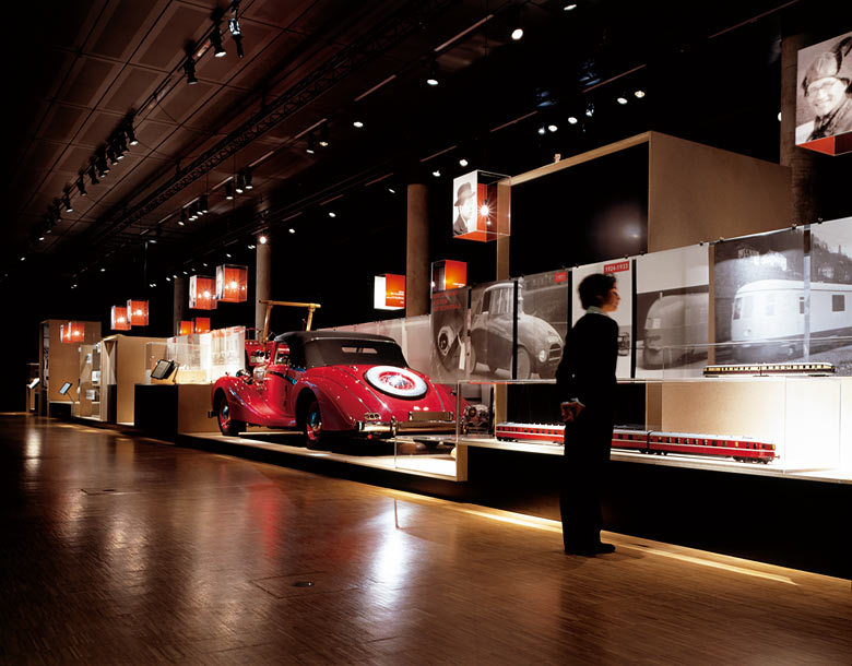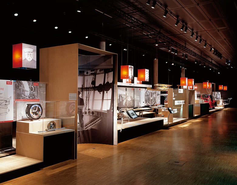 Ein 40m langes Podest fasst die heterogenen Exponate aus den unterschiedlichen Disziplinen des technischen Designs zusammen.