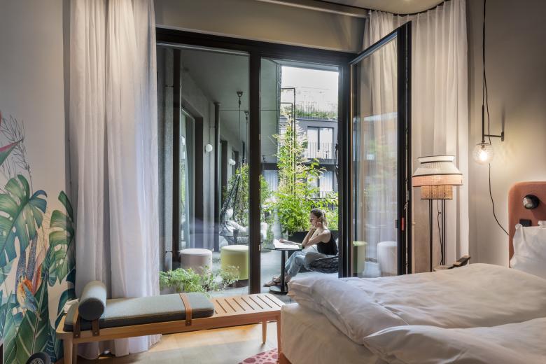 Ein Großteil der insgesamt 158 Zimmer geht auf den 185m² großen Innenhof hinaus, wo die von den Balkonen hängenden Pflanzen als eine Art grüner Vorhang und Blickschutz dienen und dieserart Privatsphäre schaffen. Auch hier sorgen Wanddekoration, Farben und Materialen für Wienbezug, wie etwa im Falle des Wiener Geflechts, das etwa bei den Zimmerlampen und in Stuhllehnen zur Anwendung kommt. Außerdem unterteilen sich die Zimmer in drei Design-Kategorien, die den Wien-Bezug unterschiedlich umsetzen. Nämlich zum einen in solche, die sich in das Thema des verstecken Gartens einfügen und diesen etwa auf Vorhängen wie Tapeten aufgreifen. Und zum anderen in jene, in deren Industrie-Design, Stahl und Sichtbeton das urbane Umfeld des Bezirks Margareten widerspiegeln. Und schließlich noch in eine dritte Kategorie, die mit orientalischen Mustern und Dekorationselementen auf den multikulturellen Charakter des nahegelegenen Naschmarkts verweist, der schließlich ein gleichfalls kennzeichnendes Element für Wien und den 5. Bezirk darstellt.
