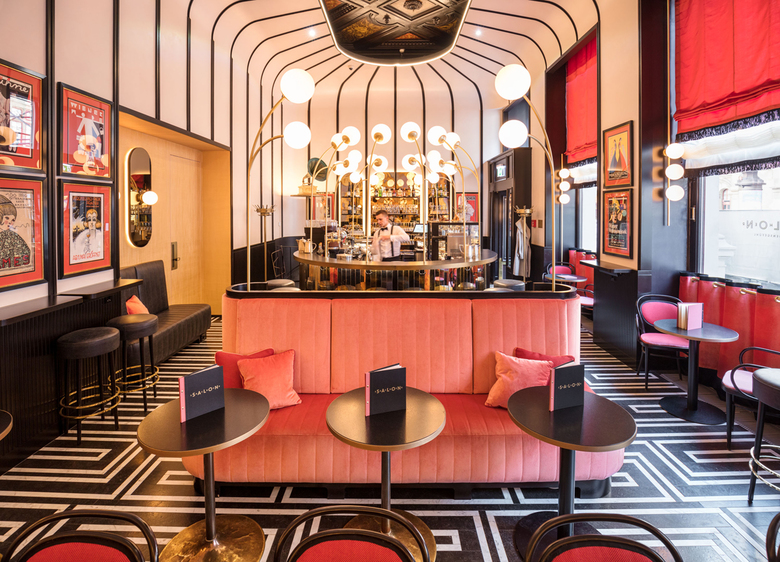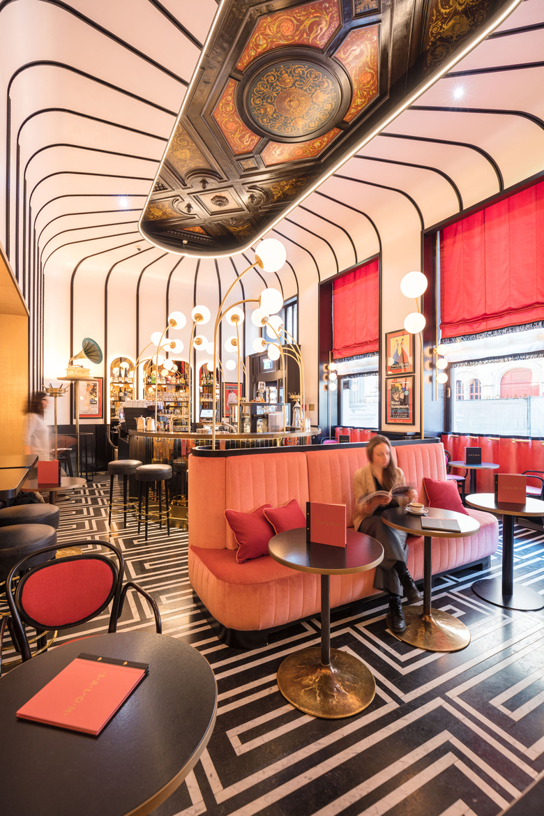 BWM Architekten haben nach dem Re-Design des Sacher Eck Ende 2017 auch die ehemalige Sacher Stube einer Neugestaltung unterzogen: Im Salon Sacher, so der neue Name, gehen die Farben Schwarz und Koralle ganz im Stile der 1920er- und 1950er-Jahre Hand in Hand. Gebogene Kugelleuchten setzen die Bar als Centerpiece in Szene, getönte Spiegel, schwarze Linien und metallische Effekte runden das Bild stimmig ab. Absoluter Hingucker ist eine erhaltene Stuckdecke – bis dato versteckt hinter dem Plafond, haben BWM diesem historischen Juwel mittels eines großen Deckenausschnitts wieder zu neuem Glanz verholfen.