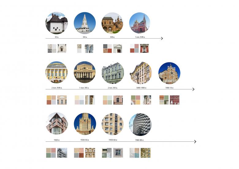 The palette of color shades of the facades directly depends on the area of influence of which magnet falls this or that part of the building.