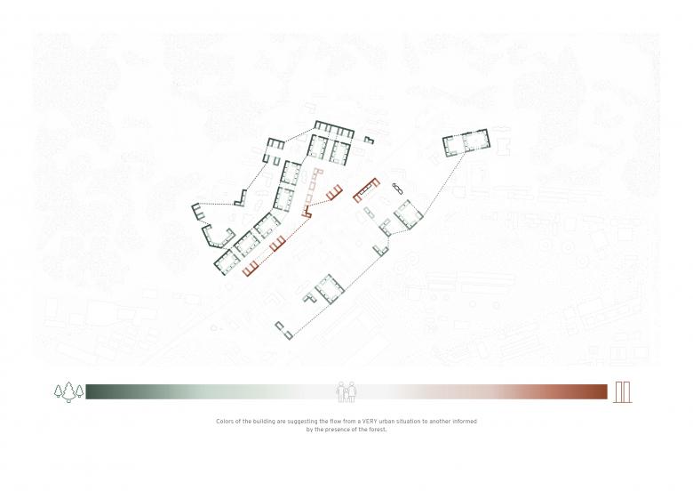 The project interacts with the forest both on a physical level (manipulating the typologies, making the facades plastic and turning them towards the forest) and on a conceptual-material level (thanks to the study of materiality and color that become a guide to identify public spaces and the facades and their relations with the forest.