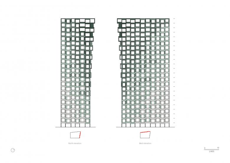The towers overlooking Otkrytoye Shosse Boulevard have a decidedly monumental and iconic character. The only visual element that determines the physical design of the facade is the gradient of increasing the size of the openings upwards - from the small ones in the lower level,facing a part of the city which is more noisy and active, to the large ones in the upper part of the towers, which also offer the best views.