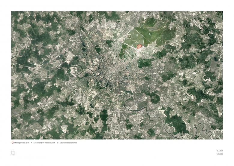 There are two main elements, which constitute the backbone of the Metrogorodok site: the Losiny Ostro National Park (the largest green area in Moscow) on the northern border and the existing urban axis of Otkrytoye Shosse Boulevard.
