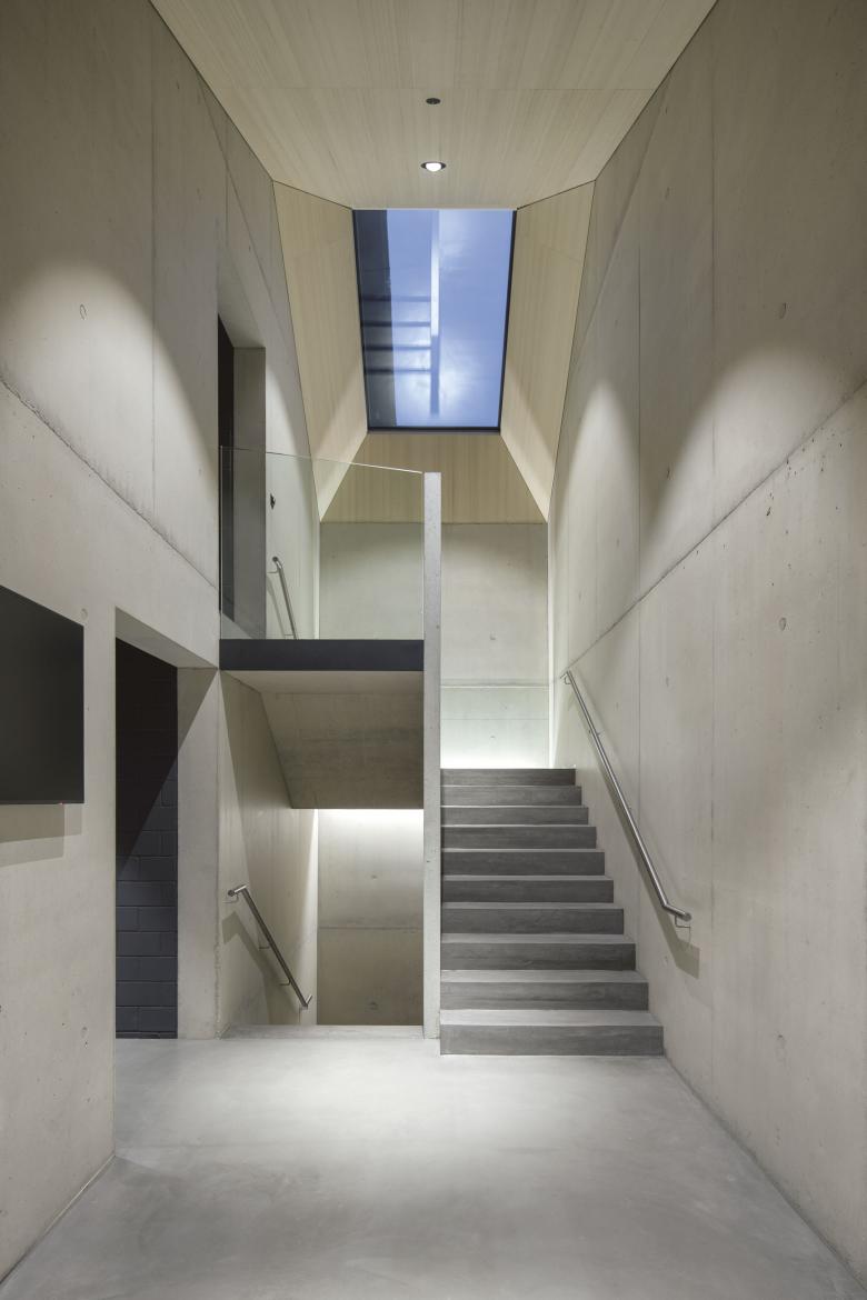 Der ebenerdige Veranstaltungsraum überzeugt mit luftiger Grosszügigkeit, stringenter Materialwahl und starken Aussenraumbezügen. Die Verbindung von Sichtbeton und Holz wirkt stimmig. Alle Aussenwände sind im Inneren mit Weisstanne verkleidet, was optische Akzente setzt und eine angenehme Akustik gewährleistet.