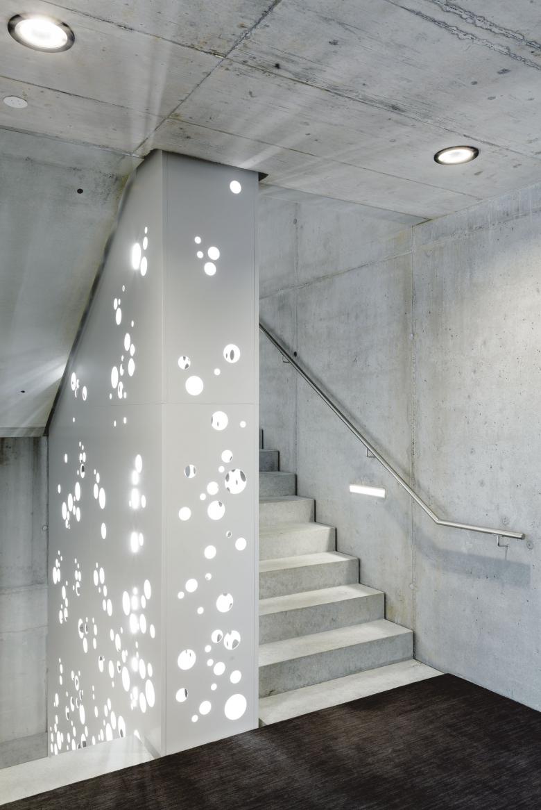 Wie die Flaschenböden im Inneren eines Weinkartons verteilen sich runde Glasscheiben in zwei Grössen über die Wand, die Foyer und Büro vom kavernenartigen zweigeschossigen Hochregallager trennt. Dort befinden sich die beleuchteten Präsentationsnischen – sortiert nach Provenienz der Weine. Im südlichen Bereich des Gebäudes liegen sechs grosszügige Wohnungen.
