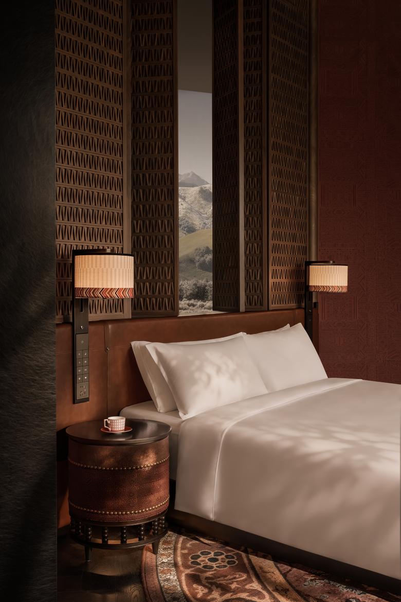 The journey begins in pursuit of light. Inspired by the Nalati sunrise, the hotel’s entrance features a curved canopy that evokes radiating sunbeams. Greeted with a traditional Aul-style welcome, guests are immediately immersed in an atmosphere rich with local culture.