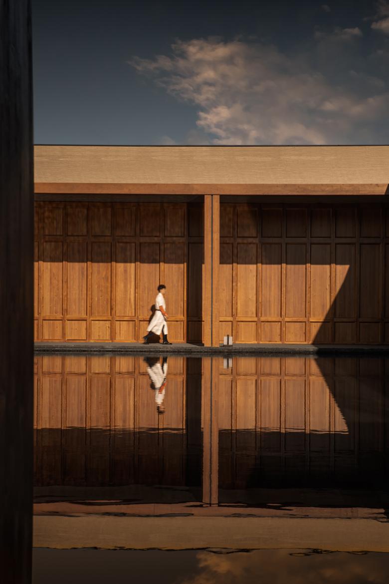 With its building volumes scattered across the open wilds, the hotel complex appears like a small forest when viewed from afar. Rooted in steppe culture, it adopts a dispersed layout, with individual structures linked by winding woodland paths. The surrounding forest landscape is seamlessly integrated into the hotel’s ecological system, creating a hospitality environment in symbiosis with nature.