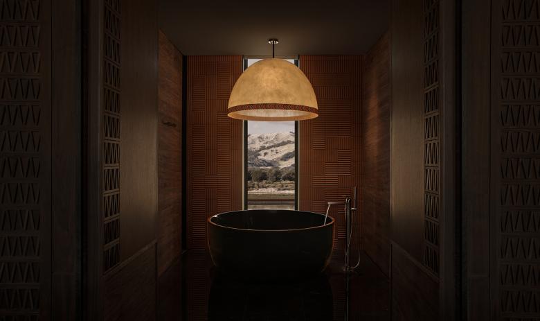 The traditional yurt’s diamond-lattice wooden framework is reimagined across the bathroom walls and partitions. Paired with warm wood tones, the space exudes quiet intimacy and a soothing calm.