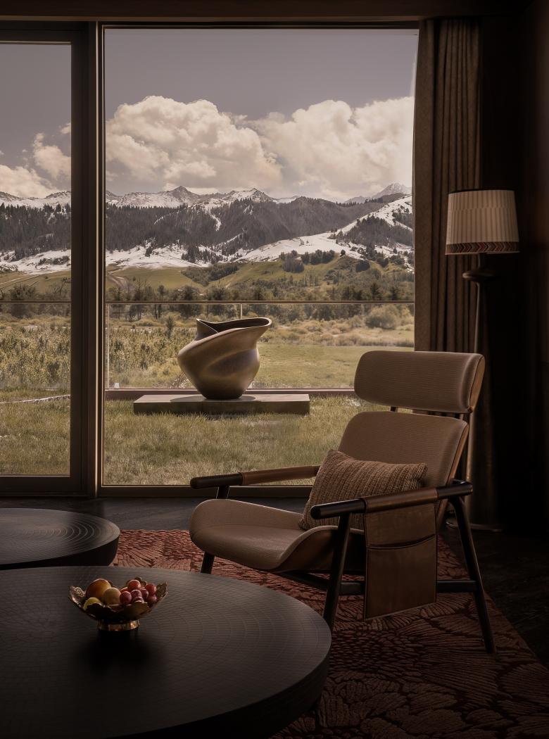 The space exudes a quiet sense of restraint, echoing the vastness and quiet composure of the grasslands. A sweeping curved window frames a boundless view, drawing the distant Nalati Grassland and the majestic Tianshan Mountains into the interior. Light becomes a poetic storyteller, tracing the shifting seasons across a brick-red canvas.
