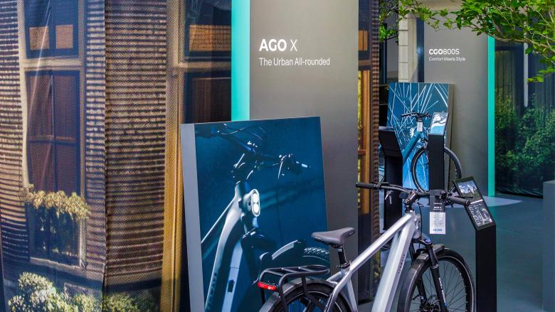 Inspiriert vom Bühnenbau, kreieren abgehängte Stoffbahnen Flächen und Volumen, die das Gefühl einer „Pop-Up-Stadt“ vermitteln. Im Scheinwerferlicht wird der Fokus auf die Hauptdarsteller gelenkt: Gestaffelte Bühnen präsentieren die verschiedenen E-Bike-Modelle, ergänzt durch stimmungsvolle Lightwalls, die die einzigartigen Details der Produkte betonen.