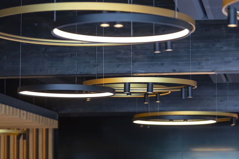 Mit ihrem ausschließlich nach unten strahlendem Licht kaschieren die bis tief in den Raum abgependelten Superloop-Leuchten von Delta Light die Decke. Während die schwarzen Ringleuchten für eine angenehme Grundbeleuchtung sorgen, nehmen die Leuchten in Flemish Gold 90 kleine Spy On-Richtstrahler auf, welche die Tische mit Abstrahlwinkeln von 33° gleichmäßig in warm-weißes Licht tauchen. Die Abhängung in drei verschiedenen Höhen verleiht dem Raum einen spielerischen Akzent und das Flemish Gold, in dem sich auch die Reflektoren der Strahler zeigen, bewirkt eine festliche Atmosphäre. Bieten die Strahler bereits aufgrund ihrer Justierbarkeit – sie sind bis 90° schwenk- und bis 355° drehbar – große Beleuchtungsflexibilität, wird diese von der Plug&Play Montage noch übertroffen. Bei wechselnder Konfiguration der Tische für unterschiedliche Anlässe wird Spy On einfach an jeder beliebigen Stelle des Rings eingeklipst, so dass das gerichtete Licht immer dort ist, wo es benötigt wird. Die Kombination von Superloop und Spy On ermöglichte den Planern eine gelungene Synthese aus Dekoration und Funktion.