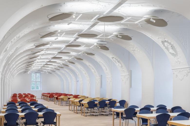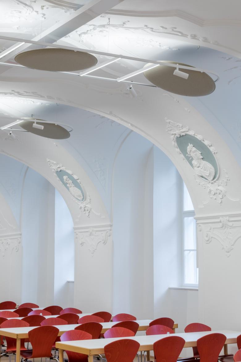 Der große Speisesaal wurde im 17. Jhdt. errichtet und beeindruckt mit seiner Architektur und den aus dem 18. Jhdt. stammenden gerahmten Porträtköpfe. Mit seinen ca. 180 Sitzplätzen finden Kinder vom Kindergarten, der Volkschule, des Gymnasiums und des Internats Platz. Aufgrund der Raumgeometrie (ca. 42 M lang, ca. 6,7 M breit, ca. 4,5 M hoch, Gewölbe) ist die Bauakustik sehr ungünstig (langer Nachhall). Mit den eingesetzten Leuchten mit den Akustikelementen konnte der Nachhall deutlich reduziert werden, und die Bauakustik verbessert werden. Die Leuchten sind in jeder Fensterachse, deren Stichkappengewölbe mit dem Hauptgewölbe ein Kreuzgewölbe ausbilden, angeordnet. Eine Leuchte in einer Fensterachse besteht aus Insgesamt 4 direkt/indirekt Lichtbändern, 4 Spots und 3 Akustikelementen. Insgesamt sind 14 Leuchten über die ganze Saallänge angeordnet.