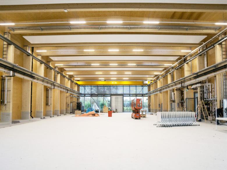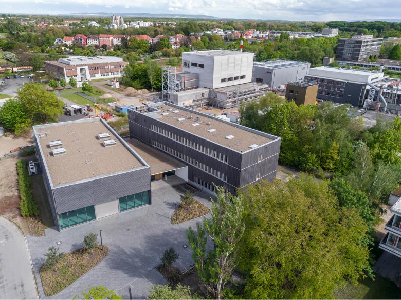 Die Erschließung erfolgt durch das zentral gelegene Foyer. Von hier aus lassen sich alle Bereiche des Instituts erreichen. Im Erdgeschoss des Institutsgebäudes befinden sich ebenengleich mit dem Prüffeld die Labor- und Lagerräume. Im ersten Obergeschoss sind die Büroarbeitsplätze vorgesehen. Der Gebäuderiegel mit Laboren und Büros ist höchst variabel. Es ist möglich, flexibel räumliche Bereiche für Gruppen- und Abteilungsstrukturen zu bilden.