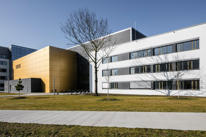 Der Bürotrakt passt sich, durch seine Farbgebung und Material, an die Bestandsbebauung an, dagegen wird der Labortrakt mit seiner goldfarbenen Metallfassade bewusst von den umgebenden Gebäuden abgesetzt.