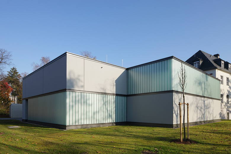 Der Neubau greift die offene Bauweise auf dem Campus auf. Farben und Materialien orientieren sich an den vorhandenen, teilweise historischen Bauten. Über einen geschlossenen Verbindungsgang ist der benachbarte Altbau zu erreichen, in dem die eigentlichen Experimente durchgeführt werden. Hier befinden sich die sanierten Labore mit Mess- und Auswerteplätzen sowie Büroräume.