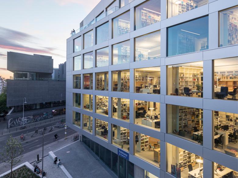 Das neue Verlagsgebäude des Suhrkamp Verlags am Rosa-Luxemburg-Platz in Berlin-Mitte nach Plänen von Bundschuh Architekten ist Teil eines städtebaulichen Ensembles aus drei Gebäuden [Bürogebäude I, Bürogebäude II, Wohngebäude], die sich um einen öffentlichen Platz gruppieren.