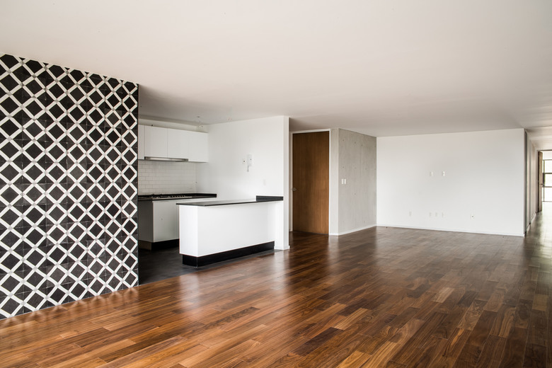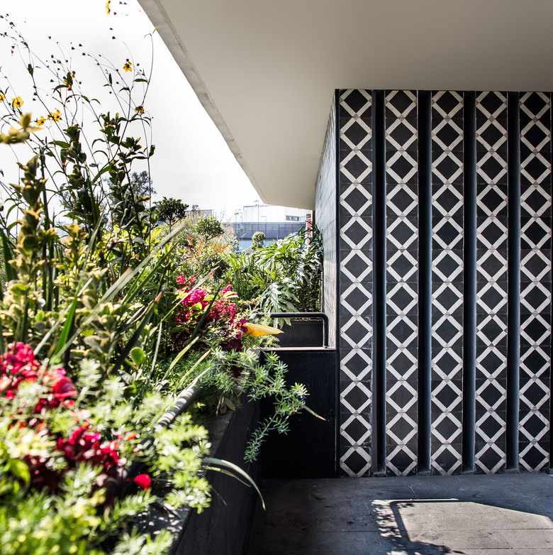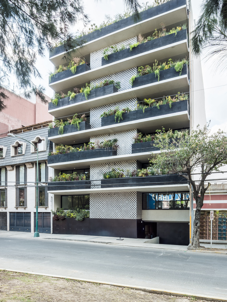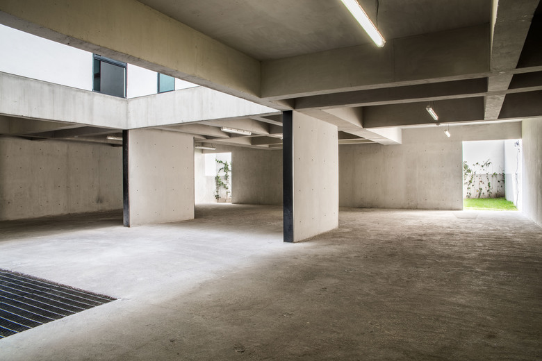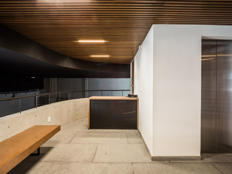 El acceso principal se remete en el cuerpo y conduce a un lobby que se reviste de maderas y materiales pétreos en tonos claros. La transición vertical marca el límite del primer sótano de estacionamiento y el área de recepción, y a su vez establece una conexión entre la planta de acceso, las viviendas y el Roof Garden.